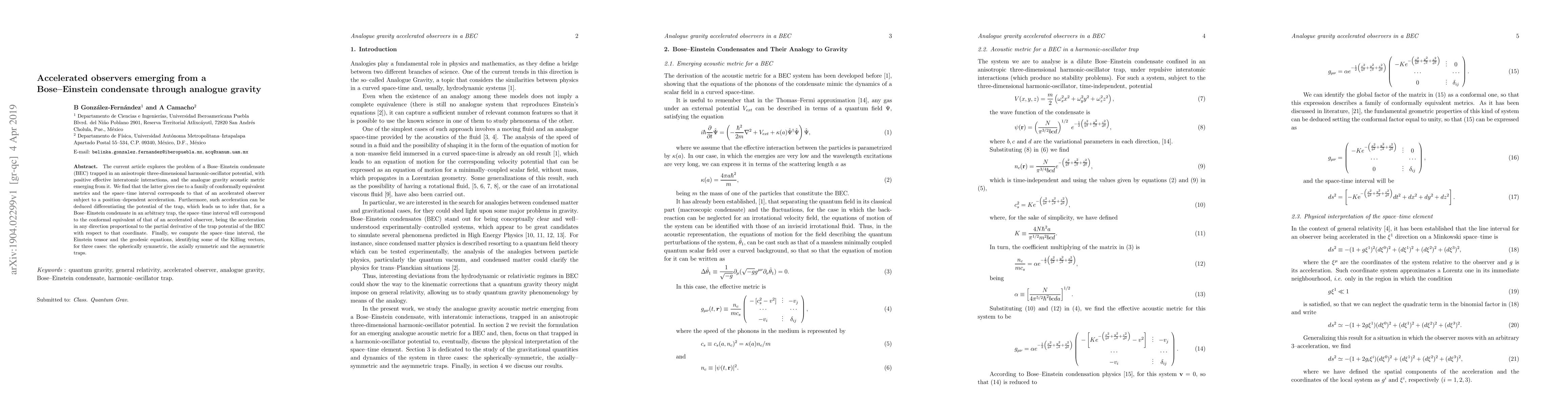 The current article explores the problem of a Bose-Einstein condensate (BEC) trapped in an anisotropic three-dimensional harmonic-oscillator potential, with positive effective interatomic interactions, and the analogue gravity acoustic metric emerging from it. We find that the latter gives rise to a family of conformally equivalent metrics and the space-time interval corresponds to that of an accelerated observer subject to a position-dependent acceleration. Furthermore, such acceleration can be deduced differentiating the potential of the trap, which leads us to infer that, for a Bose-Einstein condensate in an arbitrary trap, the space-time interval will correspond to the conformal equivalent of that of an accelerated observer, being the acceleration in any direction proportional to the partial derivative of the trap potential of the BEC with respect to that coordinate. Finally, we compute the space-time interval, the Einstein tensor and the geodesic equations, identifying some of the Killing vectors, for three cases: the spherically symmetric, the axially symmetric and the asymmetric traps.