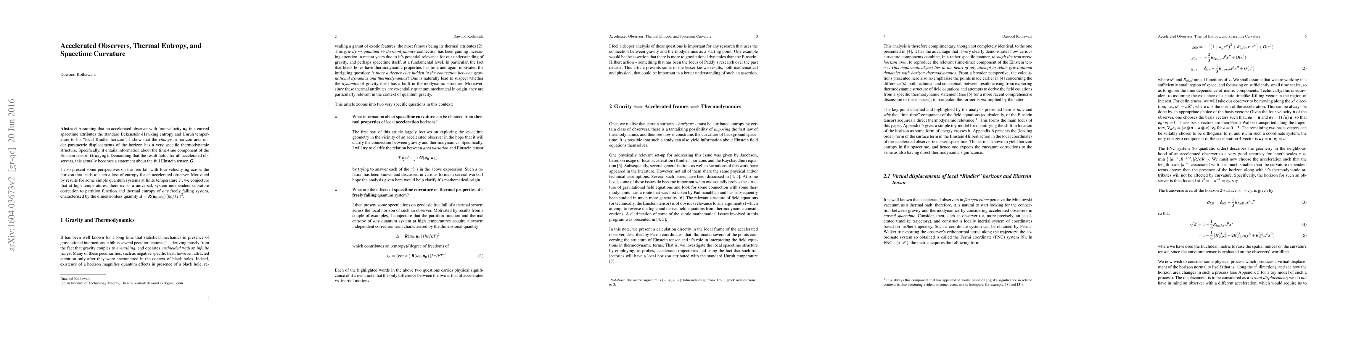Assuming that an accelerated observer with four-velocity ${\bf u}_{\rm R}$ in a curved spacetime attributes the standard Bekenstein-Hawking entropy and Unruh temperature to his "local Rindler horizon", we show that the $\rm \it change$ in horizon area under parametric displacements of the horizon has a very specific thermodynamic structure. Specifically, it entails information about the time-time component of the Einstein tensor: $\bf G({\bf u}_{\rm R}, {\bf u}_{\rm R})$. Demanding that the result holds for all accelerated observers, this actually becomes a statement about the full Einstein tensor, $\rm \bf G$. We also present some perspectives on the free fall with four-velocity ${\bf u}_{\rm ff}$ across the horizon that leads to such a loss of entropy for an accelerated observer. Motivated by results for some simple quantum systems at finite temperature $T$, we conjecture that at high temperatures, there exists a universal, system-independent curvature correction to partition function and thermal entropy of $\rm \it any$ freely falling system, characterised by the dimensional quantity $\Delta = {\bf R({\bf u}_{\rm ff}, {\bf u}_{\rm ff})} \left(\hbar c/kT \right)^2$.