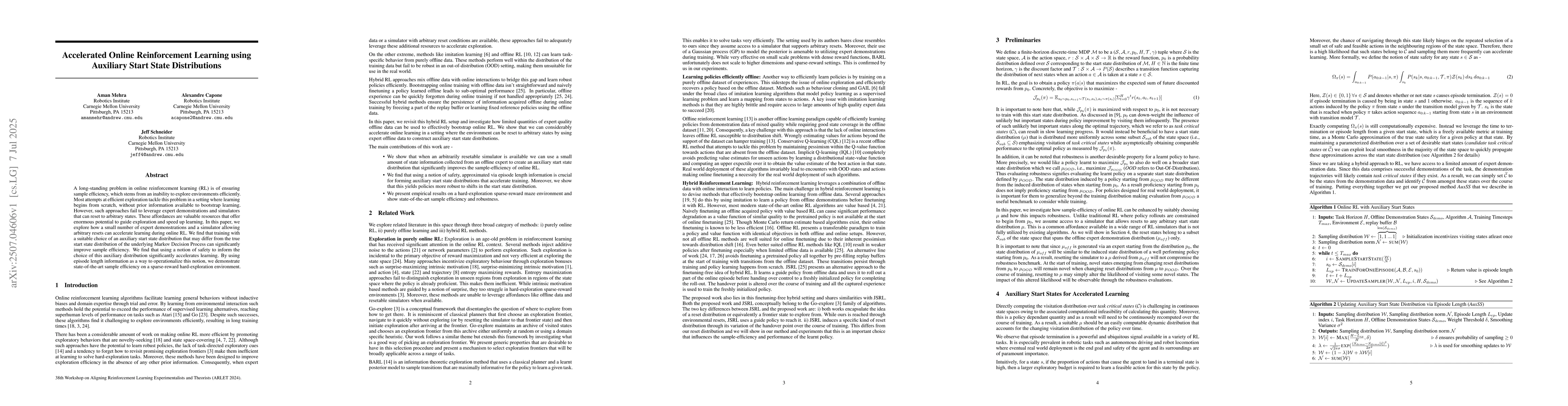 This research introduces a method to enhance sample efficiency in online reinforcement learning (RL) by utilizing expert demonstrations and a state-resetting simulator. It proposes using an auxiliary start state distribution, distinct from the true MDP's, to guide exploration and improve learning speed. The method's effectiveness is demonstrated on a challenging environment, showcasing state-of-the-art sample efficiency.