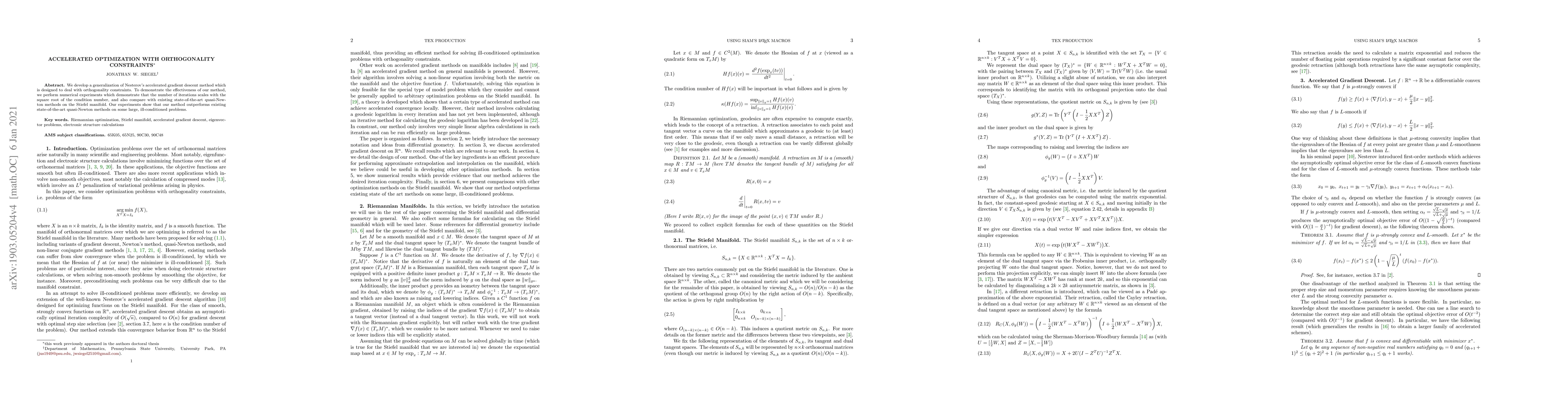 We develop a generalization of Nesterov's accelerated gradient descent method which is designed to deal with orthogonality constraints. To demonstrate the effectiveness of our method, we perform numerical experiments which demonstrate that the number of iterations scales with the square root of the condition number, and also compare with existing state-of-the-art quasi-Newton methods on the Stiefel manifold. Our experiments show that our method outperforms existing state-of-the-art quasi-Newton methods on some large, ill-conditioned problems.