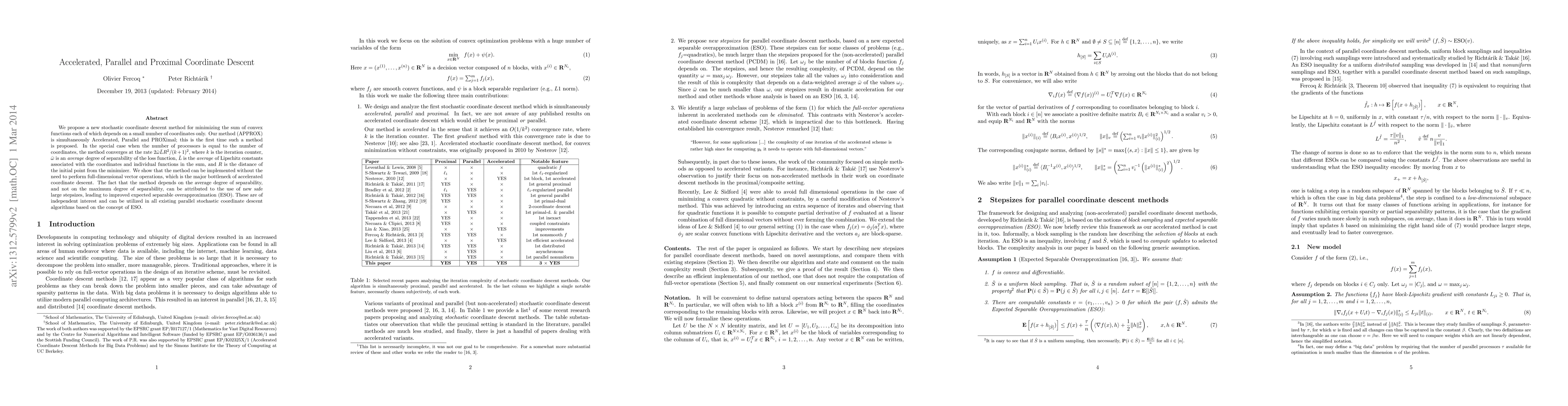 This paper introduces APPROX, a novel stochastic coordinate descent method that is Accelerated, Parallel, and PROXimal, achieving faster convergence rates without full-dimensional vector operations. The method leverages new safe large stepsizes for improved expected separable overapproximation, benefiting parallel implementations.