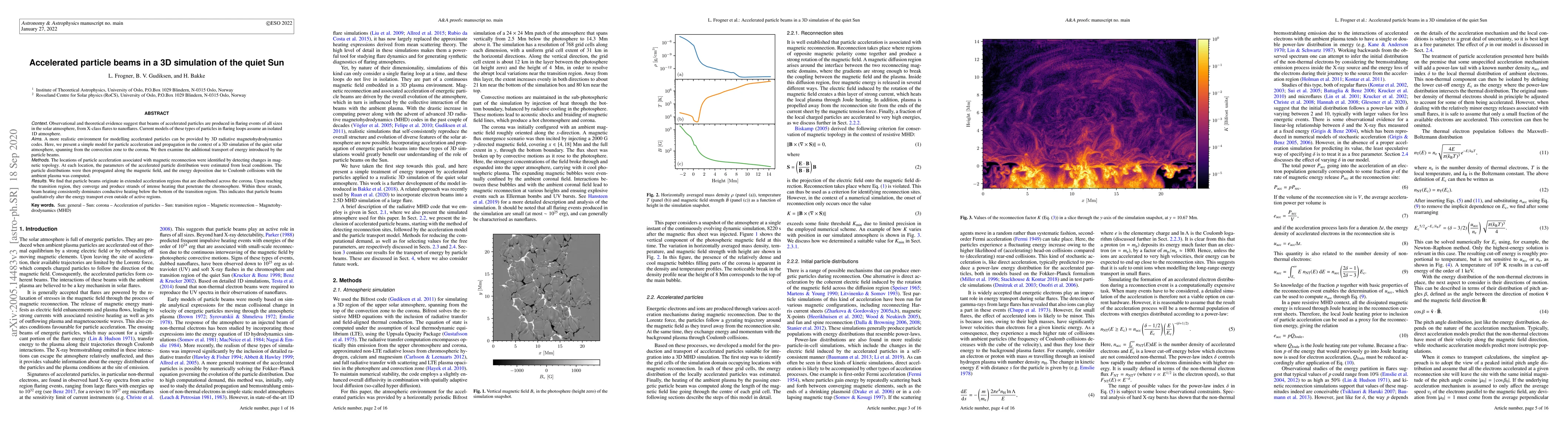 This paper presents a 3D simulation of the quiet Sun to model accelerated particle beams, finding that these beams originate in distributed corona regions and produce intense heating strands that penetrate the chromosphere, significantly altering energy transport.