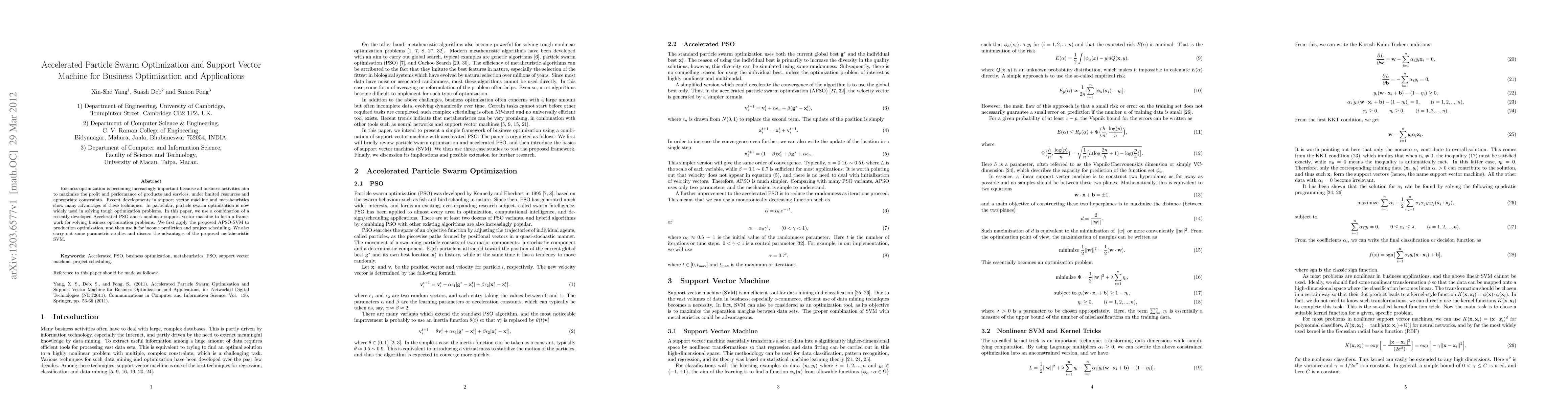This paper proposes an Accelerated PSO combined with a nonlinear Support Vector Machine (APSO-SVM) framework to tackle business optimization challenges, including production optimization, income prediction, and project scheduling. The study demonstrates the effectiveness of this hybrid approach through various applications and parametric studies.