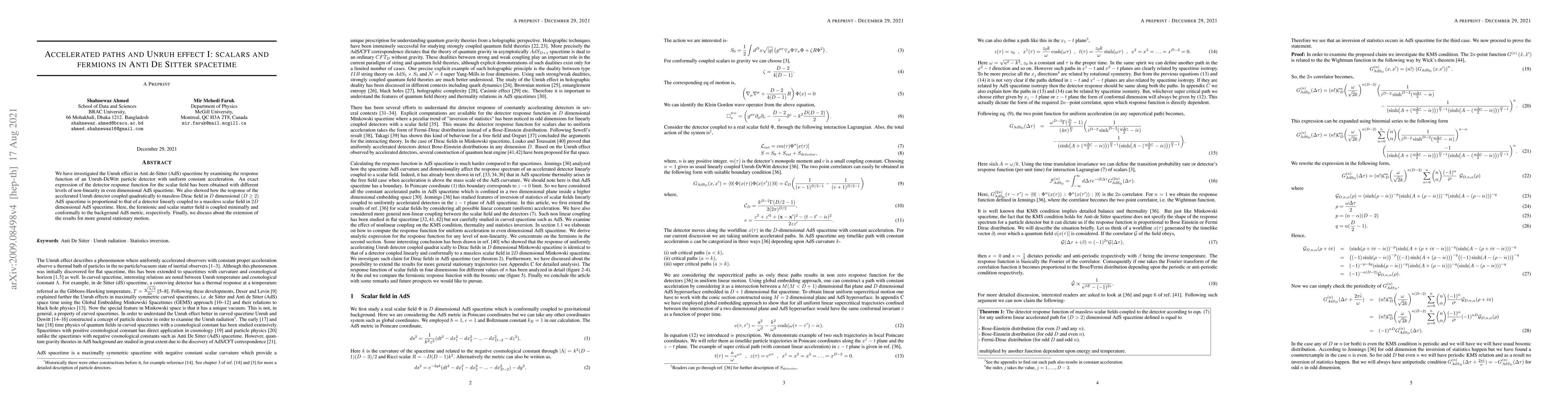This paper investigates the Unruh effect in Anti de-Sitter (AdS) spacetime using an Unruh-DeWitt particle detector, deriving exact response functions for scalar fields and showing a proportional relationship for detectors coupled to massless Dirac fields in AdS. The study extends to more general stationary motion.