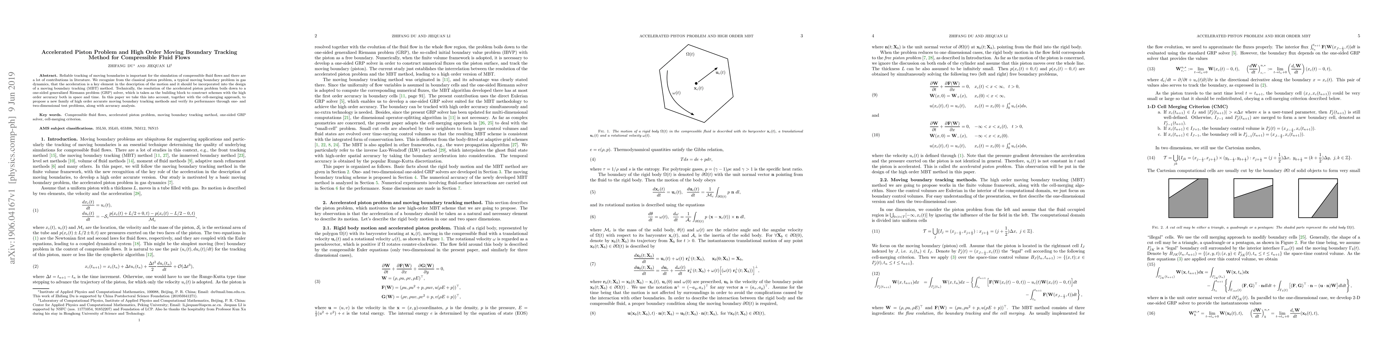 This paper proposes a new high-order accurate moving boundary tracking method for compressible fluid flows, incorporating the acceleration of the piston problem as a key element. The method utilizes a one-sided generalized Riemann problem solver and cell-merging techniques, and is validated through one- and two-dimensional test problems with accuracy analysis.