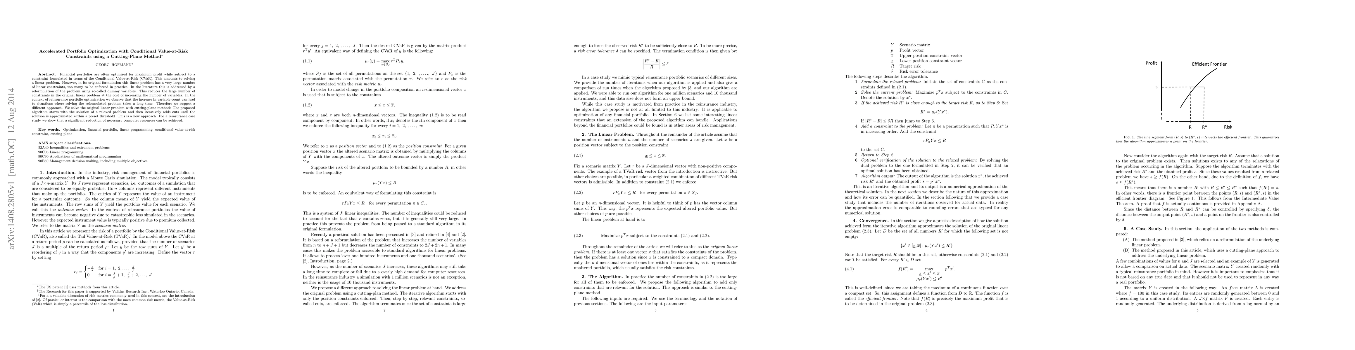 This paper proposes a cutting-plane method to optimize financial portfolios under Conditional Value-at-Risk (CVaR) constraints, addressing the impracticality of large linear constraints in traditional linear programming. The method iteratively refines the solution, reducing computational time and resource usage compared to reformulation approaches.
