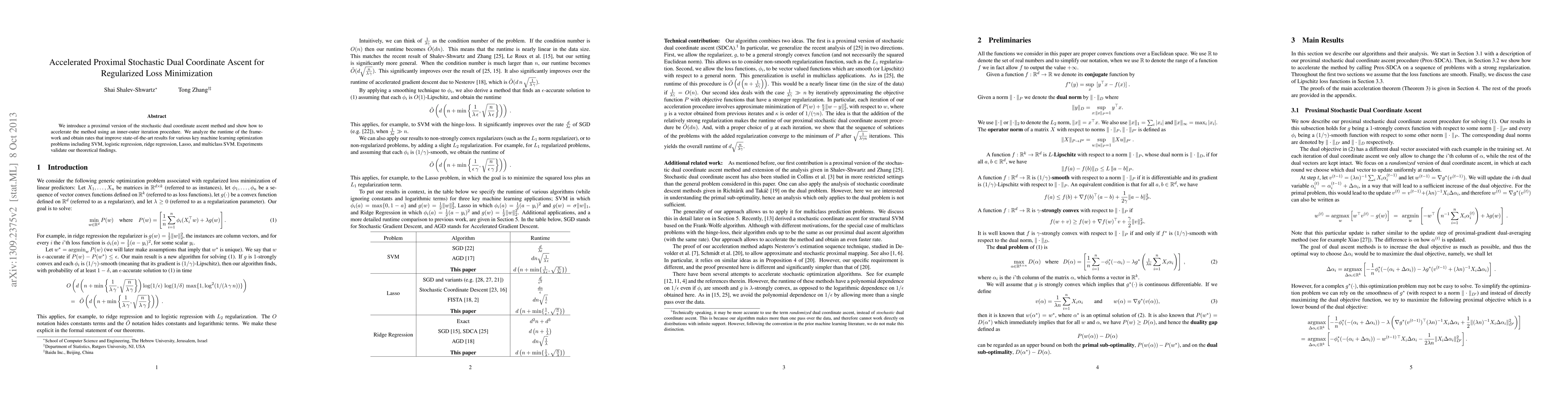 This paper presents an accelerated proximal version of the stochastic dual coordinate ascent method, utilizing an inner-outer iteration procedure to enhance efficiency. The proposed framework achieves improved runtime rates for regularized loss minimization in various machine learning optimization problems, validated by experimental results.