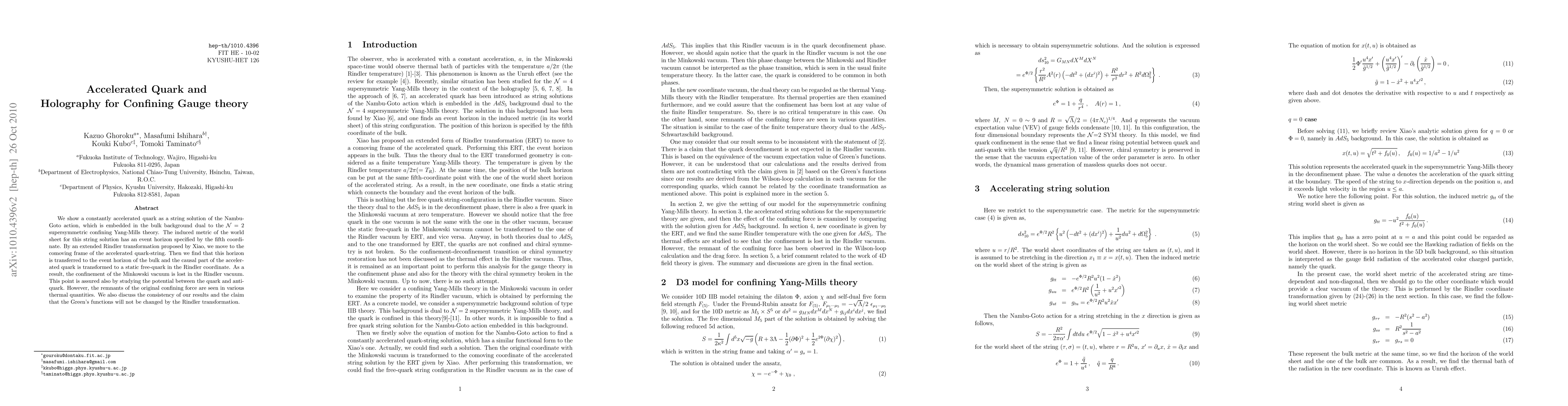 We show a constantly accelerated quark as a string solution of the Nambu-Goto action, which is embedded in the bulk background dual to the $\cal{N}$ $=2$ supersymmetric confining Yang-Mills theory. The induced metric of the world sheet for this string solution has an event horizon specified by the fifth coordinate. By an extended Rindler transformation proposed by Xiao, we move to the comoving frame of the accelerated quark-string. Then we find that this horizon is transferred to the event horizon of the bulk and the causal part of the accelerated quark is transformed to a static free-quark in the Rindler coordinate. As a result, the confinement of the Minkowski vacuum is lost in the Rindler vacuum. This point is assured also by studying the potential between the quark and anti-quark. However, the remnants of the original confining force are seen in various thermal quantities. We also discuss the consistency of our results and the claim that the Green's functions will not be changed by the Rindler transformation.