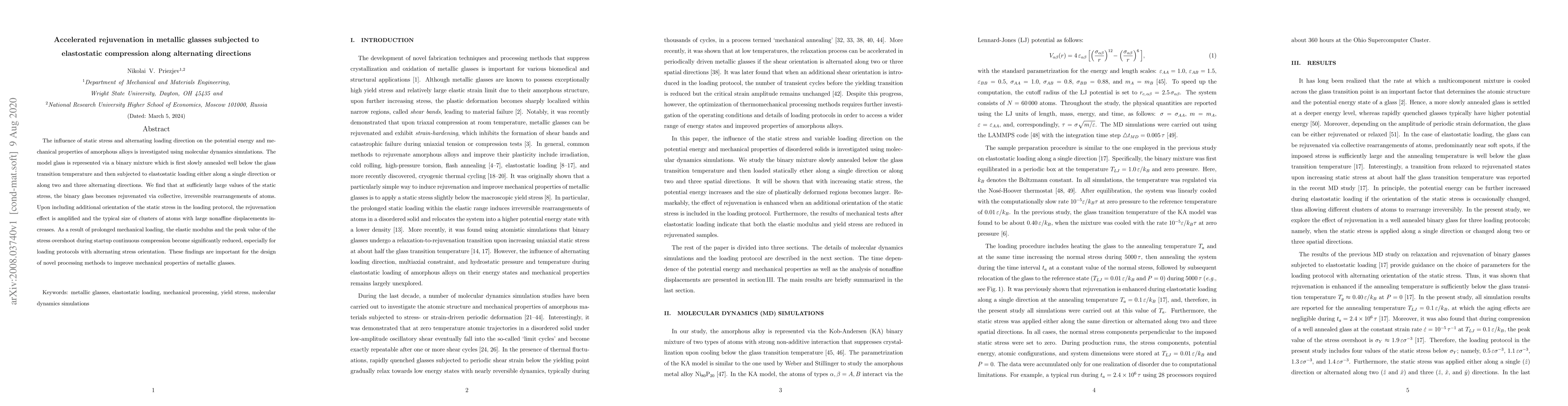 This study investigates how static stress and alternating loading directions affect the rejuvenation and mechanical properties of amorphous alloys using molecular dynamics simulations. The results show that alternating stress orientations significantly enhance rejuvenation and reduce the elastic modulus and stress overshoot, suggesting improved processing methods for metallic glasses.