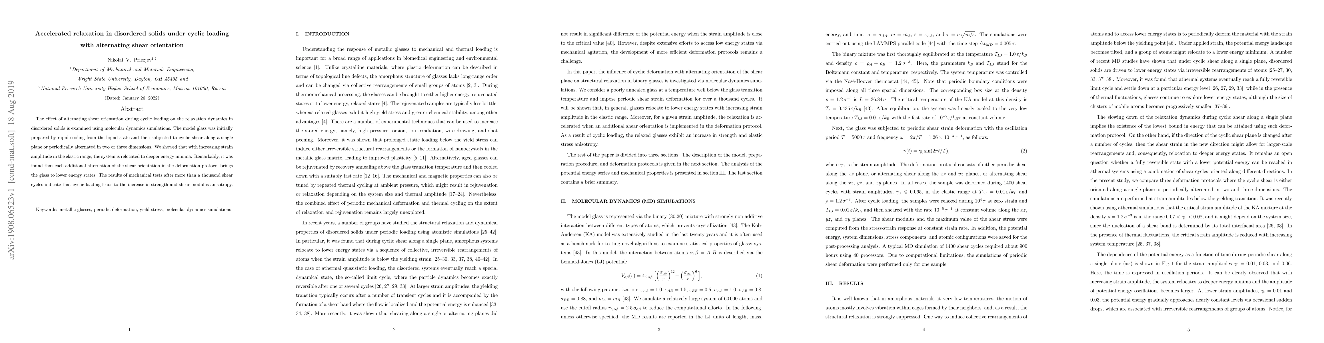 Summary: Molecular dynamics simulations reveal that cyclic loading with alternating shear orientations in disordered solids leads to accelerated relaxation and relocation to deeper energy minima, resulting in increased strength and shear-modulus anisotropy after numerous cycles.