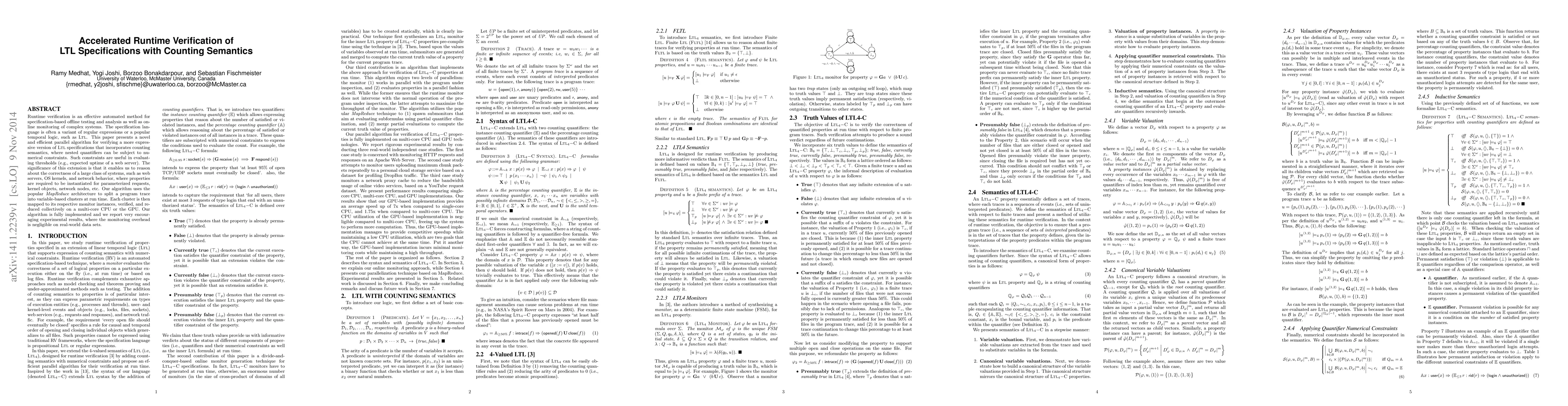 This paper introduces a parallel algorithm for efficiently verifying extended LTL specifications with counting semantics using MapReduce. The algorithm splits program traces into clusters for parallel verification on multi-core CPUs or GPUs, achieving negligible monitoring overhead on real-world datasets.