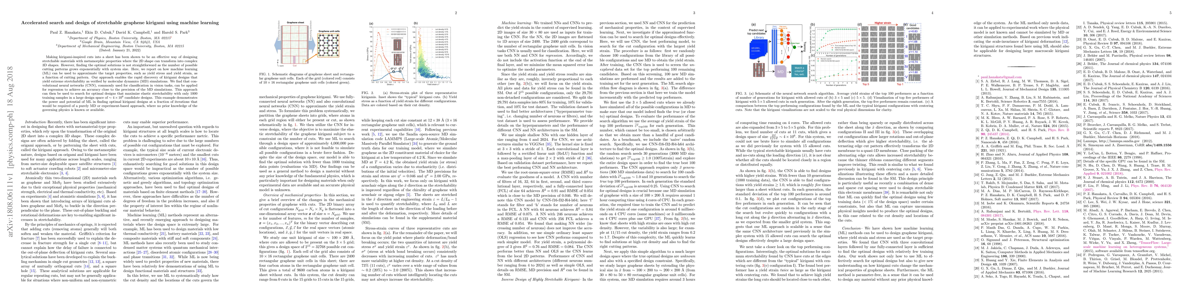 Making kirigami-inspired cuts into a sheet has been shown to be an effective way of designing stretchable materials with metamorphic properties where the 2D shape can transform into complex 3D shapes. However, finding the optimal solutions is not straightforward as the number of possible cutting patterns grows exponentially with system size. Here, we report on how machine learning (ML) can be used to approximate the target properties, such as yield stress and yield strain, as a function of cutting pattern. Our approach enables the rapid discovery of kirigami designs that yield extreme stretchability as verified by molecular dynamics (MD) simulations. We find that convolutional neural networks (CNN), commonly used for classification in vision tasks, can be applied for regression to achieve an accuracy close to the precision of the MD simulations. This approach can then be used to search for optimal designs that maximize elastic stretchability with only 1000 training samples in a large design space of $\sim 4\times10^6$ candidate designs. This example demonstrates the power and potential of ML in finding optimal kirigami designs at a fraction of iterations that would be required of a purely MD or experiment-based approach, where no prior knowledge of the governing physics is known or available.