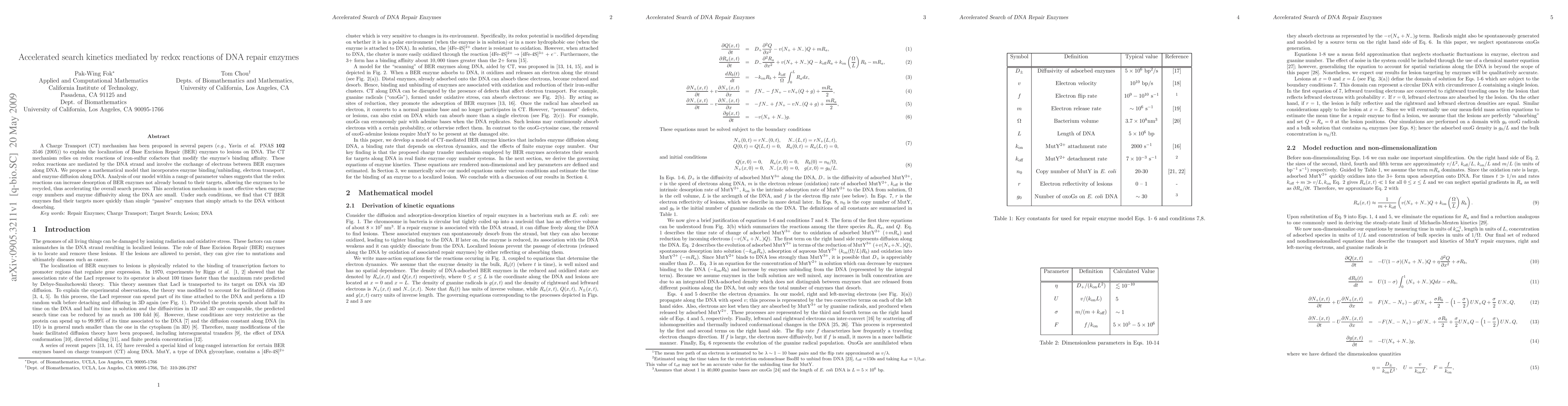 A new model suggests that redox reactions in DNA repair enzymes can accelerate search kinetics, allowing them to find their targets more quickly than passive enzymes. This acceleration is most effective when enzyme copy numbers and diffusivity along the DNA are small.