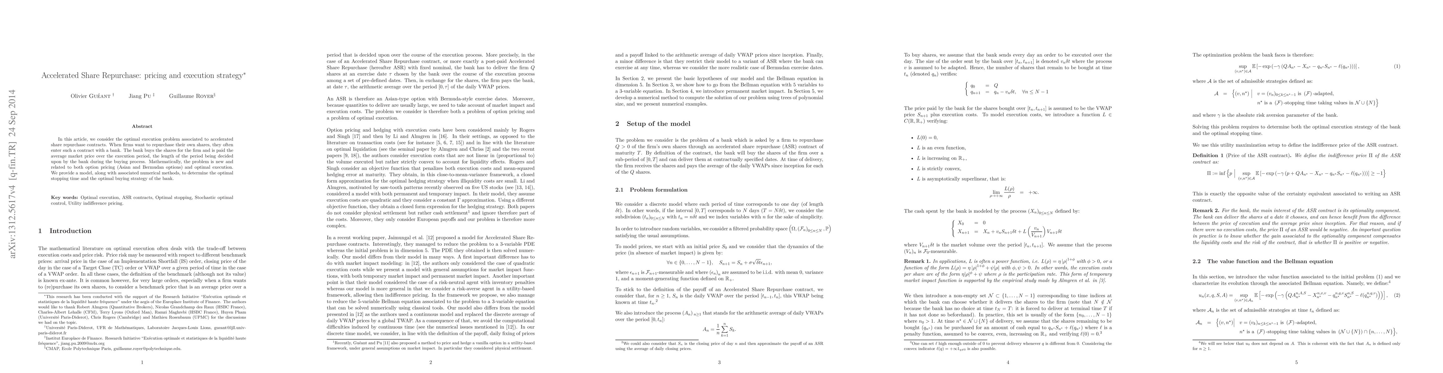 Researchers developed a model to determine the optimal stopping time and buying strategy for accelerated share repurchase contracts, balancing price and execution costs. The findings can inform banks and firms in optimizing their share repurchase agreements.