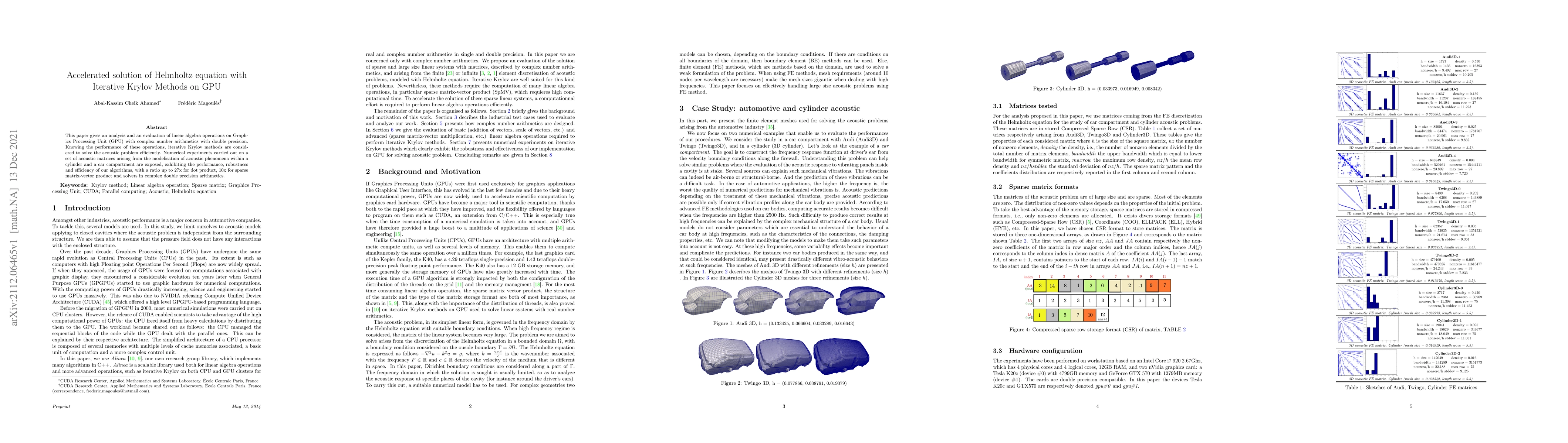 This paper evaluates the performance of linear algebra operations on GPUs for solving the Helmholtz equation using iterative Krylov methods, demonstrating significant speedups in dot products and sparse matrix-vector products, and showcasing robust and efficient algorithms for acoustic modeling.
