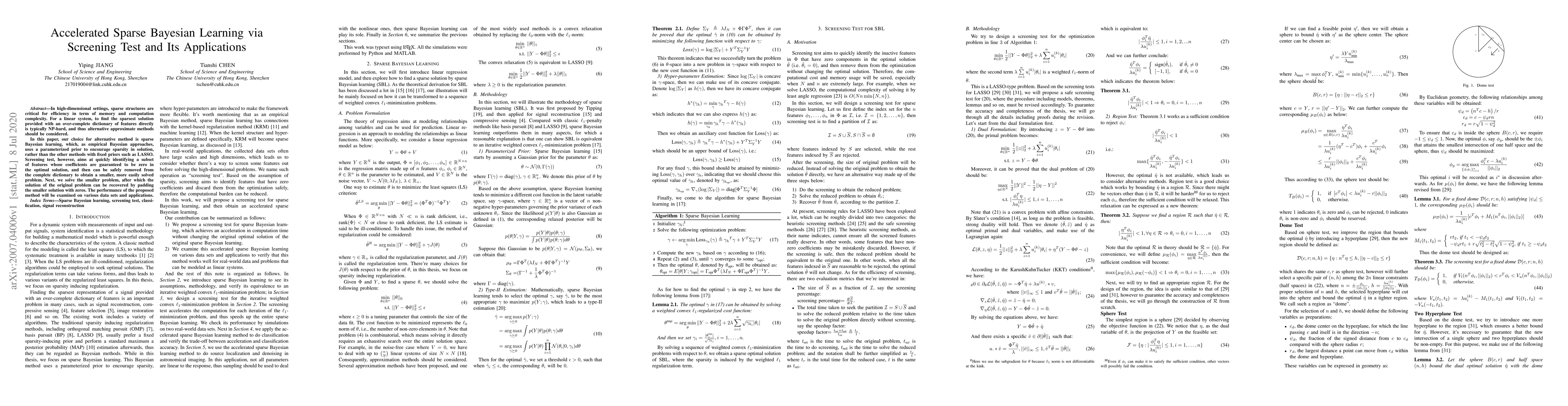 This paper proposes an accelerated sparse Bayesian learning method using a screening test to identify and discard irrelevant features, simplifying the problem and improving computational efficiency. The method's effectiveness is demonstrated through various applications and datasets.