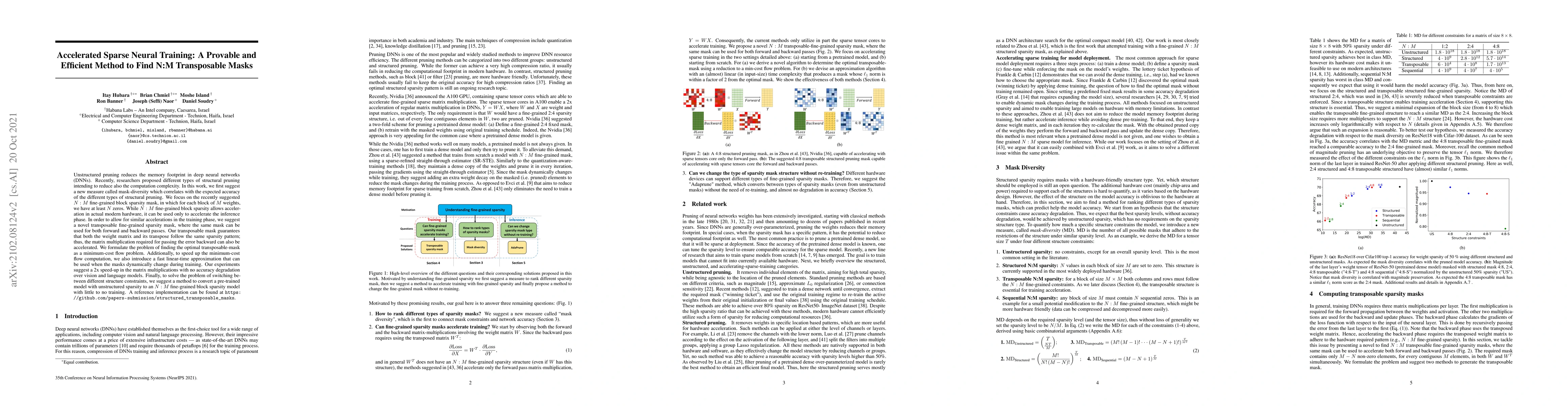 This paper proposes a novel transposable fine-grained sparsity mask to accelerate both training and inference in deep neural networks. It introduces a fast linear-time approximation for dynamic mask changes and demonstrates a 2x speed-up in matrix multiplications with no loss in accuracy.