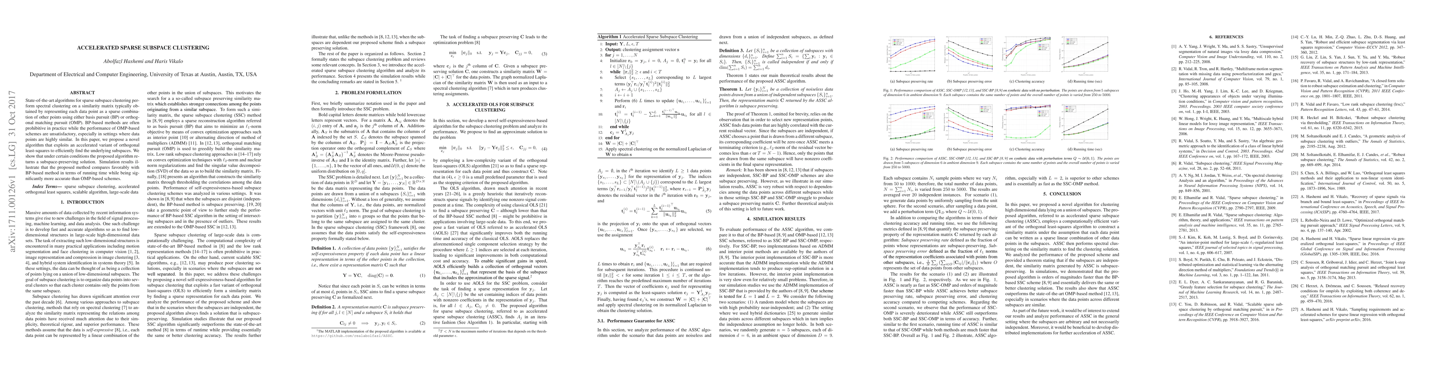 This paper introduces a novel accelerated algorithm for sparse subspace clustering that leverages an efficient variant of orthogonal least-squares to identify underlying subspaces. The proposed method outperforms both basis pursuit and orthogonal matching pursuit in terms of both speed and accuracy, especially for highly similar data points.