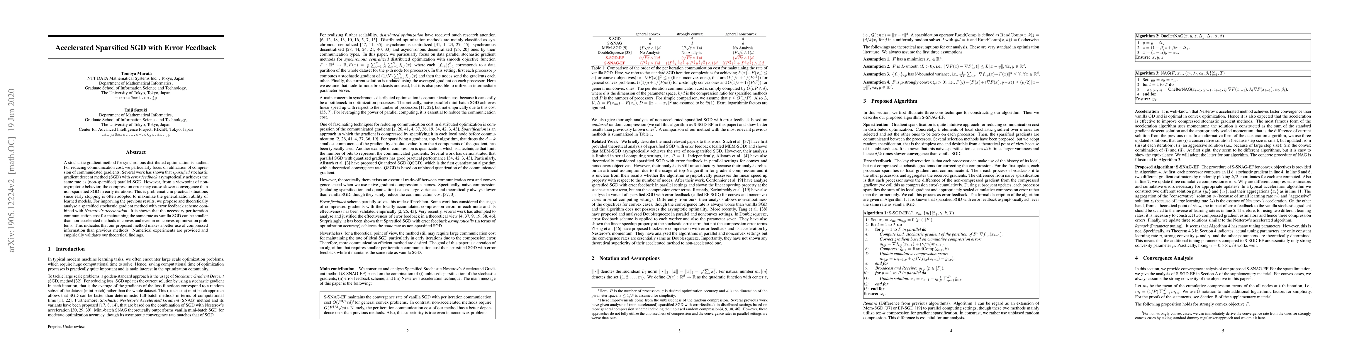 This paper proposes an accelerated sparsified SGD method with error feedback to reduce communication costs in distributed optimization. By incorporating Nesterov's acceleration, the method achieves faster convergence compared to non-accelerated sparsified SGD, especially in early iterations, while maintaining the same convergence rate as non-sparsified SGD.
