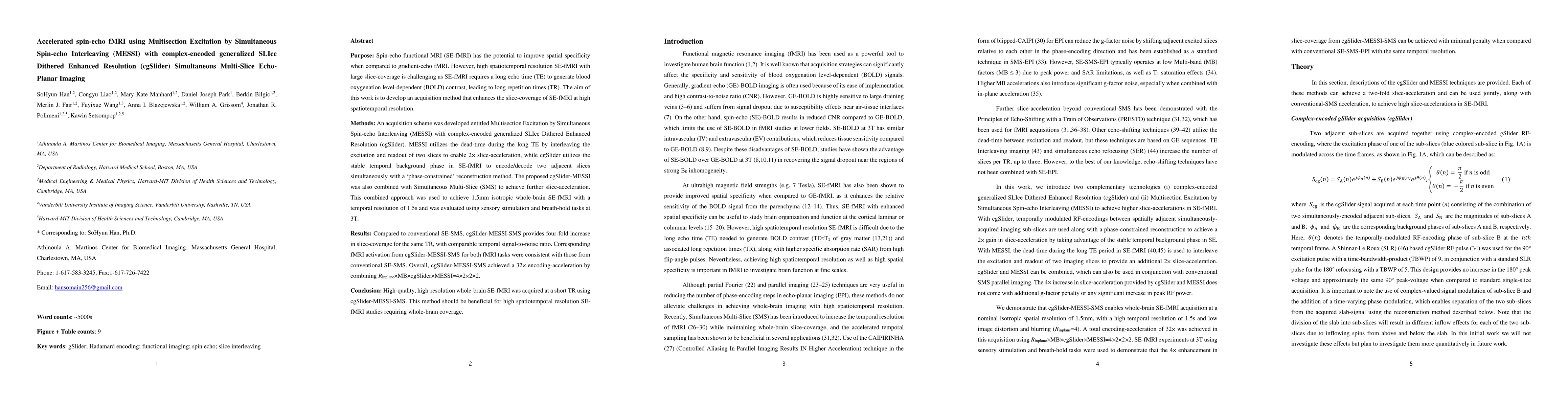 Spin-echo functional MRI (SE-fMRI) has the potential to improve spatial specificity when compared to gradient-echo fMRI. However, high spatiotemporal resolution SE-fMRI with large slice-coverage is challenging as SE-fMRI requires a long echo time (TE) to generate blood oxygenation level-dependent (BOLD) contrast, leading to long repetition times (TR). The aim of this work is to develop an acquisition method that enhances the slice-coverage of SE-fMRI at high spatiotemporal resolution. An acquisition scheme was developed entitled Multisection Excitation by Simultaneous Spin-echo Interleaving (MESSI) with complex-encoded generalized SLIce Dithered Enhanced Resolution (cgSlider). MESSI utilizes the dead-time during the long TE by interleaving the excitation and readout of two slices to enable 2x slice-acceleration, while cgSlider utilizes the stable temporal background phase in SE-fMRI to encode and decode two adjacent slices simultaneously with a phase-constrained reconstruction method. The proposed cgSlider-MESSI was also combined with Simultaneous Multi-Slice (SMS) to achieve further slice-acceleration. This combined approach was used to achieve 1.5mm isotropic whole-brain SE-fMRI with a temporal resolution of 1.5s and was evaluated using sensory stimulation and breath-hold tasks at 3T. Compared to conventional SE-SMS, cgSlider-MESSI-SMS provides four-fold increase in slice-coverage for the same TR, with comparable temporal signal-to-noise ratio. Corresponding fMRI activation from cgSlider-MESSI-SMS for both fMRI tasks were consistent with those from conventional SE-SMS. Overall, cgSlider-MESSI-SMS achieved a 32x encoding-acceleration by combining RinplanexMBxcgSliderxMESSI=4x2x2x2. High-quality, high-resolution whole-brain SE-fMRI was acquired at a short TR using cgSlider-MESSI-SMS.