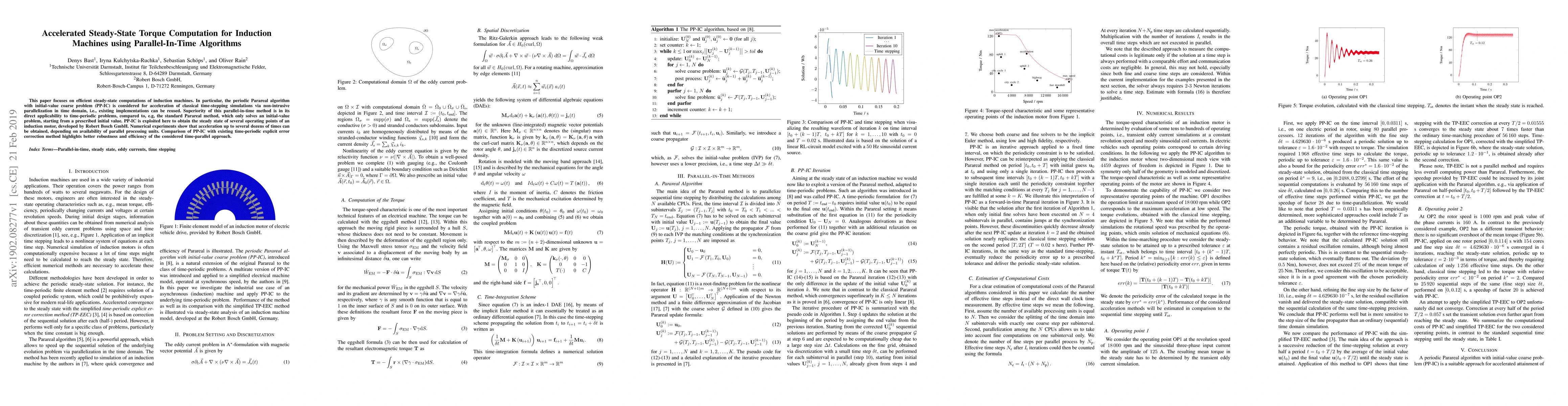 This paper focuses on efficient steady-state computations of induction machines. In particular, the periodic Parareal algorithm with initial-value coarse problem (PP-IC) is considered for acceleration of classical time-stepping simulations via non-intrusive parallelization in time domain, i.e., existing implementations can be reused. Superiority of this parallel-in-time method is in its direct applicability to time-periodic problems, compared to, e.g, the standard Parareal method, which only solves an initial-value problem, starting from a prescribed initial value. PP-IC is exploited here to obtain the steady state of several operating points of an induction motor, developed by Robert Bosch GmbH. Numerical experiments show that acceleration up to several dozens of times can be obtained, depending on availability of parallel processing units. Comparison of PP-IC with existing time-periodic explicit error correction method highlights better robustness and efficiency of the considered time-parallel approach.