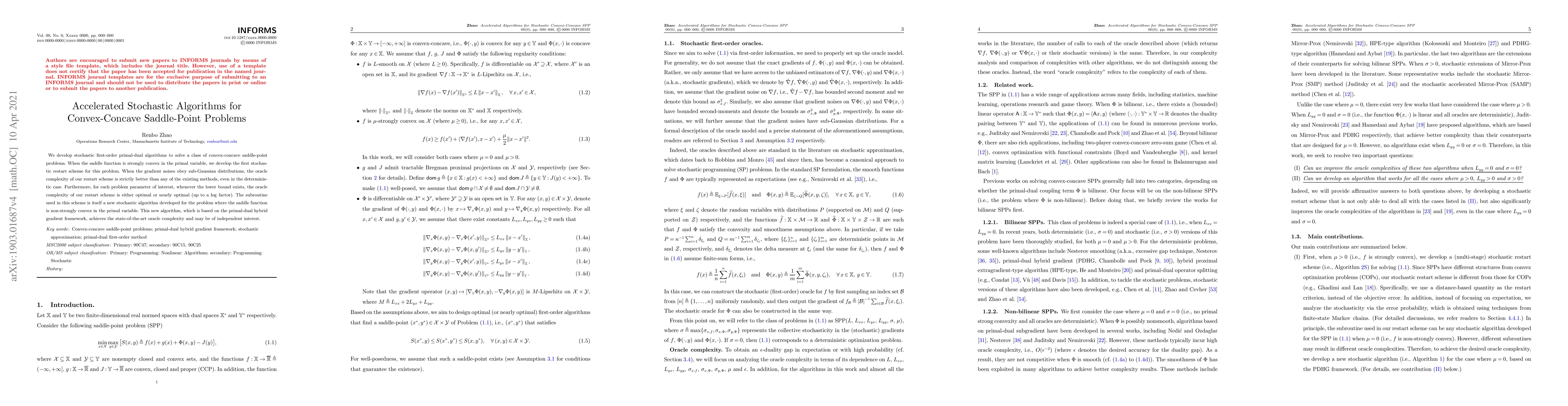 This paper introduces stochastic first-order primal-dual algorithms for solving convex-concave saddle-point problems, developing a novel stochastic restart scheme that outperforms existing methods when the gradient noise is sub-Gaussian. The proposed restart scheme achieves optimal or near-optimal oracle complexity, and includes a new stochastic algorithm based on the primal-dual hybrid gradient framework for non-strongly convex cases.