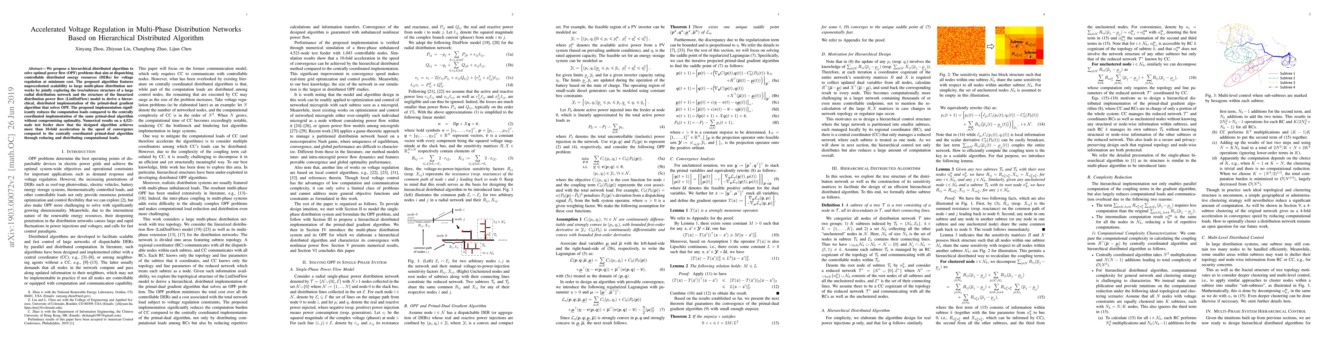 This paper proposes a hierarchical distributed algorithm for optimal power flow in large multi-phase distribution networks, leveraging the network's tree structure and the LinDistFlow model to achieve scalable, distributed voltage regulation. The algorithm significantly accelerates convergence compared to centralized methods, demonstrating over 10-fold speedup in a 4,521-node test feeder.