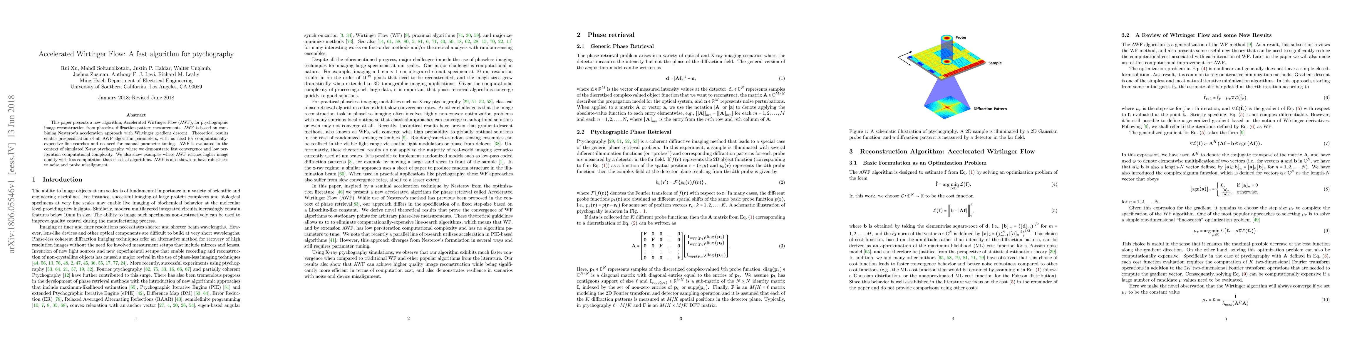 This paper introduces the Accelerated Wirtinger Flow (AWF) algorithm for fast ptychographic image reconstruction, combining Nesterov's acceleration with Wirtinger gradient descent. AWF demonstrates fast convergence, lower computational complexity, and robustness to noise and misalignment compared to classical methods.
