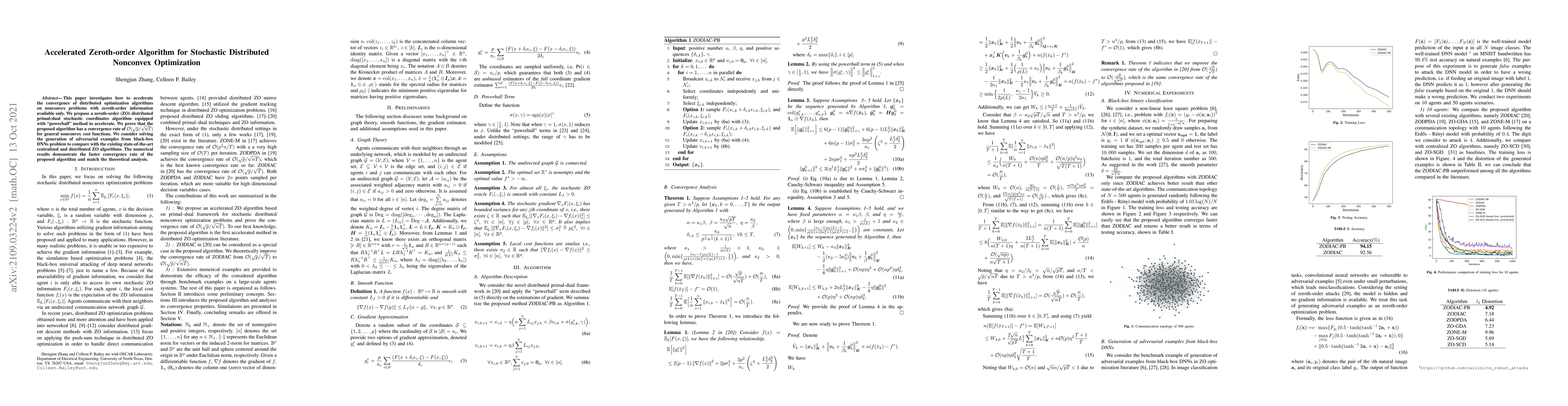 This paper proposes an accelerated zeroth-order distributed primal-dual stochastic coordinates algorithm with a "powerball" method for nonconvex optimization problems. The algorithm achieves a convergence rate of $\mathcal{O}(\sqrt{p}/\sqrt{nT})$ and demonstrates faster convergence compared to existing methods, as shown through numerical results on generating adversarial examples.