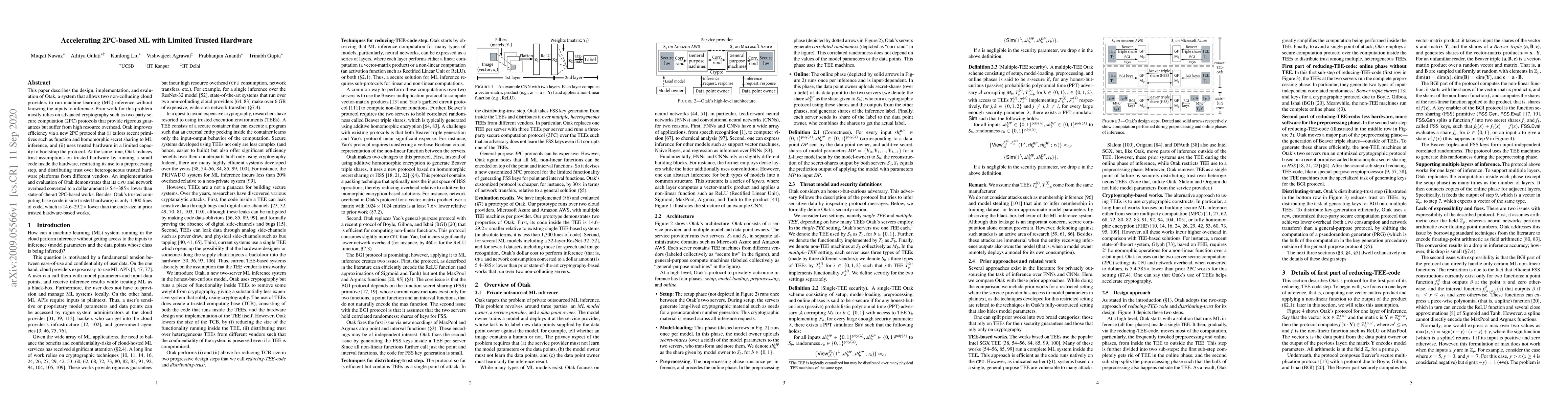 Otak accelerates machine learning inference by using a new 2PC protocol that leverages trusted hardware in a limited capacity, reducing overhead by up to $385 times.
