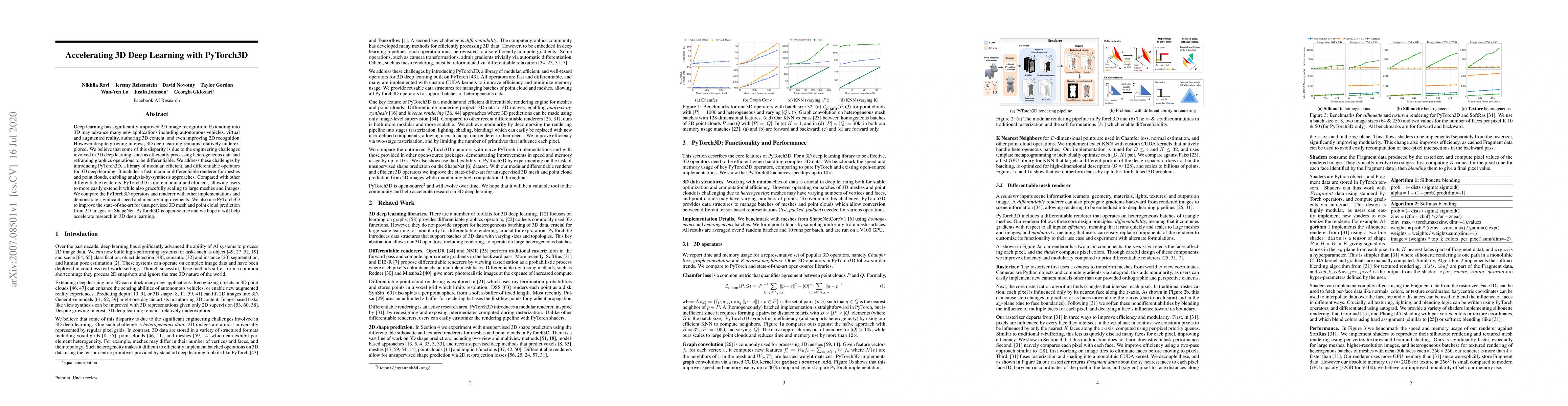 PyTorch3D is introduced to address engineering challenges in 3D deep learning, offering modular, efficient, and differentiable operators that significantly improve processing speed and memory usage. It enables advanced applications in 3D content creation and enhances state-of-the-art 3D mesh and point cloud prediction from 2D images.