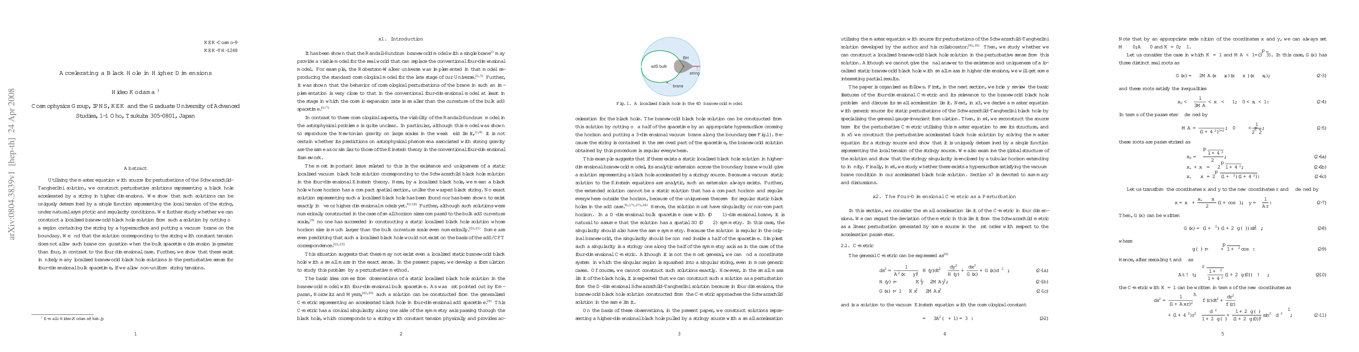 Utilising the master equation with source for perturbations of the Schwarzschild-Tangherlini solution, we construct perturbative solutions representing a black hole accelerated by a string in higher dimensions. We show that such solutions can be uniquely determined by a single function representing the local tension of the string, under natural asymptotic and regularity conditions. We further study whether we can construct a localised braneworld black hole solution from such a solution by cutting off a region containing the string by a hypersurface and putting a vacuum brane on the boundary. We find that the solution corresponding to the string with constant tension does not allow such brane configuration when the bulk spacetime dimension is greater than four, in contrast to the four dimensional case. Further, we show that there exist infinitely many localised braneworld black hole solutions in the perturbative sense for four-dimensional bulk spacetime, if we allow non-uniform string tensions.