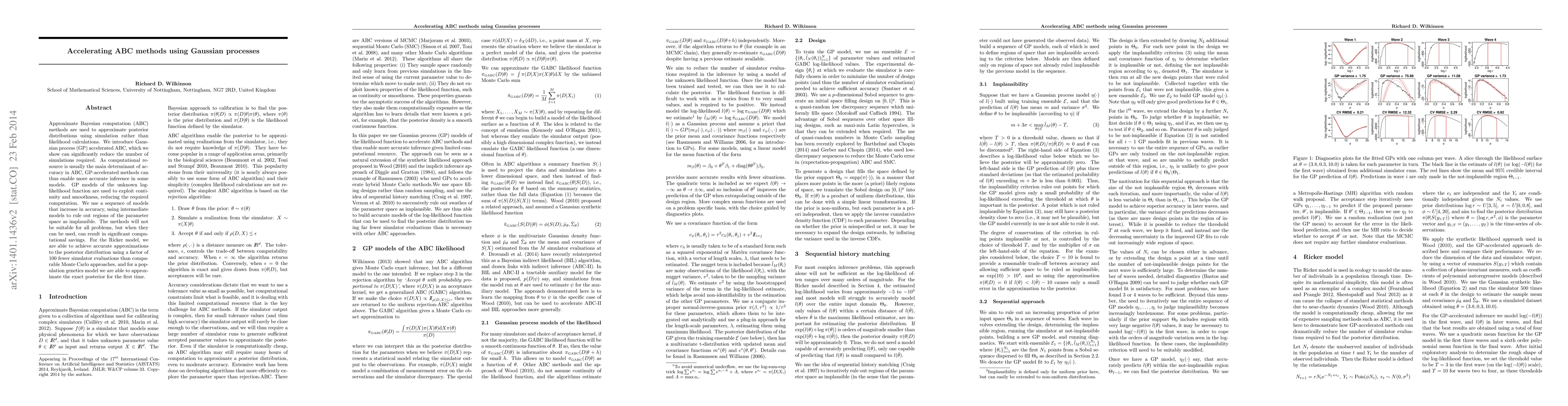 This research introduces Gaussian process (GP) accelerated Approximate Bayesian Computation (ABC) methods, significantly reducing simulation needs for posterior distribution approximations. The approach leverages GP models for log-likelihood function continuity and smoothness, enabling accurate inference with fewer computations, as demonstrated by achieving a factor of 100 fewer simulator evaluations for the Ricker model and enabling posterior approximation for a complex population genetics model.