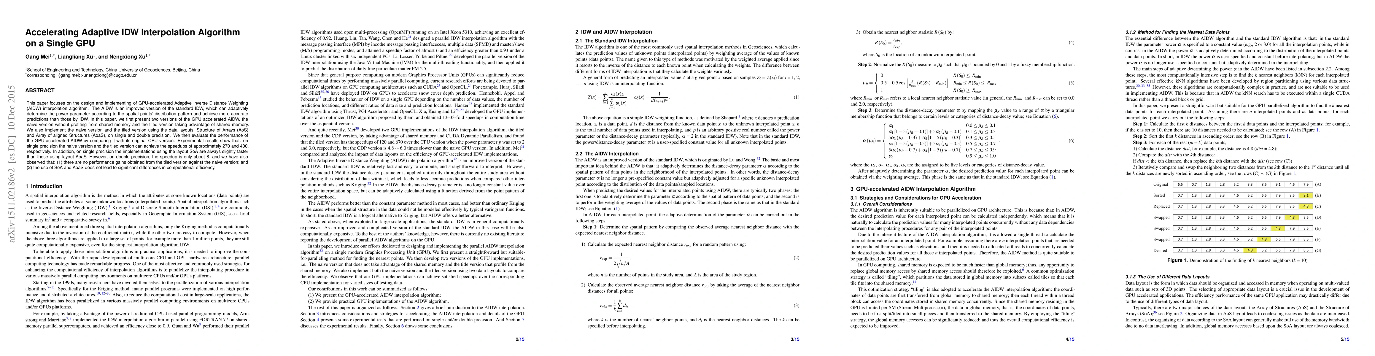 This paper presents GPU-accelerated versions of the Adaptive Inverse Distance Weighting (AIDW) interpolation algorithm, achieving significant speedups over the CPU version, especially on single precision. The tiled version utilizing shared memory outperforms the naive version, but performance gains diminish on double precision.