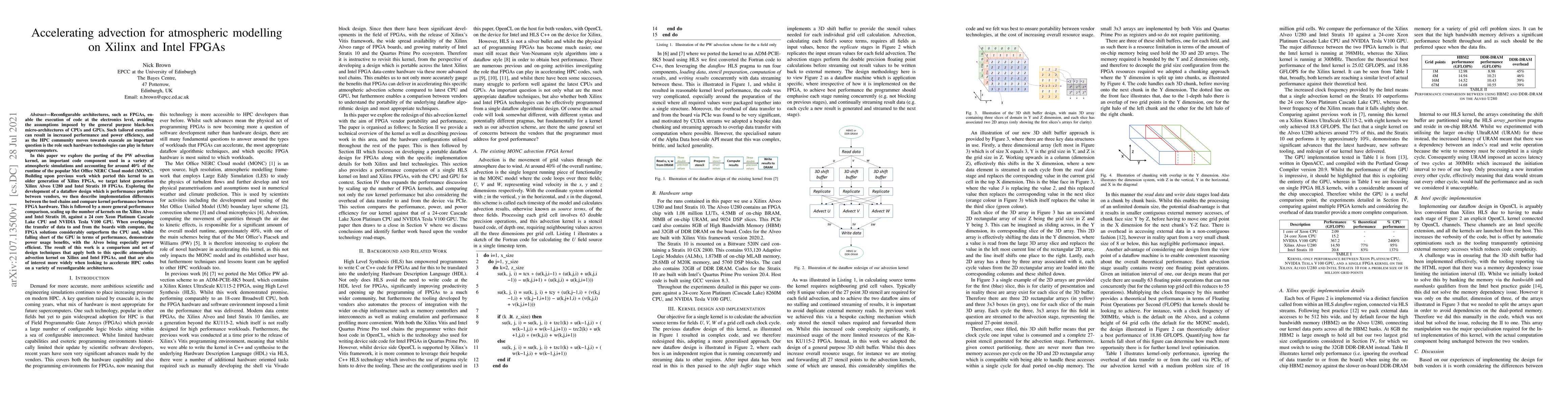 This paper explores the performance of the PW advection kernel on the latest Xilinx and Intel FPGAs, comparing it against a CPU and GPU. The FPGA solutions outperform the CPU and show power efficiency benefits, especially the Xilinx Alveo, while falling short of the GPU in raw performance.
