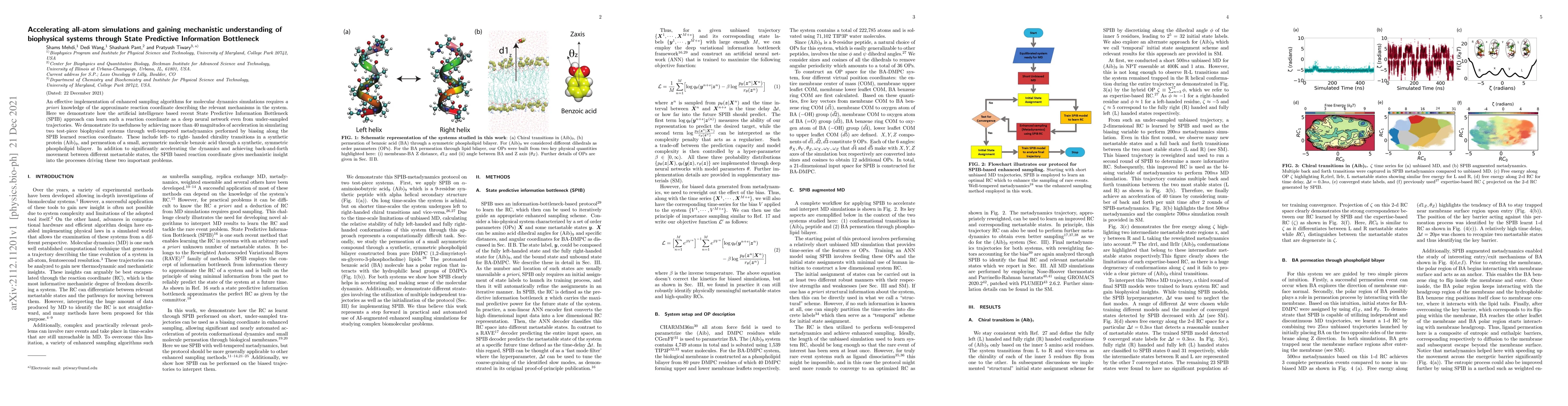 An effective implementation of enhanced sampling algorithms for molecular dynamics simulations requires a priori knowledge of the approximate reaction coordinate describing the relevant mechanisms in the system. Here we demonstrate how the artificial intelligence based recent State Predictive Information Bottleneck (SPIB) approach can learn such a reaction coordinate as a deep neural network even from under-sampled trajectories. We demonstrate its usefulness by achieving more than 40 magnitudes of acceleration in simulating two test-piece biophysical systems through well-tempered metadynamics performed by biasing along the SPIB learned reaction coordinate. These include left- to right- handed chirality transitions in a synthetic protein (Aib)_9, and permeation of a small, asymmetric molecule benzoic acid through a synthetic, symmetric phospholipid bilayer. In addition to significantly accelerating the dynamics and achieving back-and-forth movement between different metastable states, the SPIB based reaction coordinate gives mechanistic insight into the processes driving these two important problems.