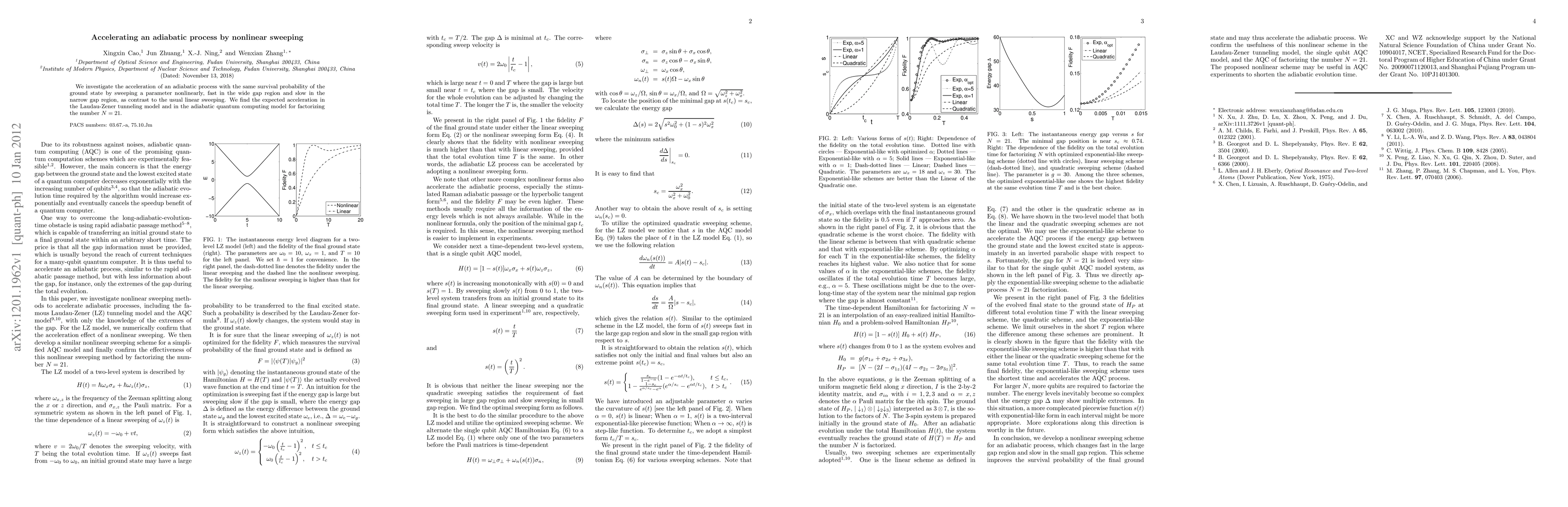 The research investigates the acceleration of an adiabatic process by nonlinearly sweeping a parameter fast in wide gap regions and slow in narrow gap regions, contrasting with linear sweeping. This is applied to the Landau-Zener tunneling model and adiabatic quantum computing model for factorizing N=21.