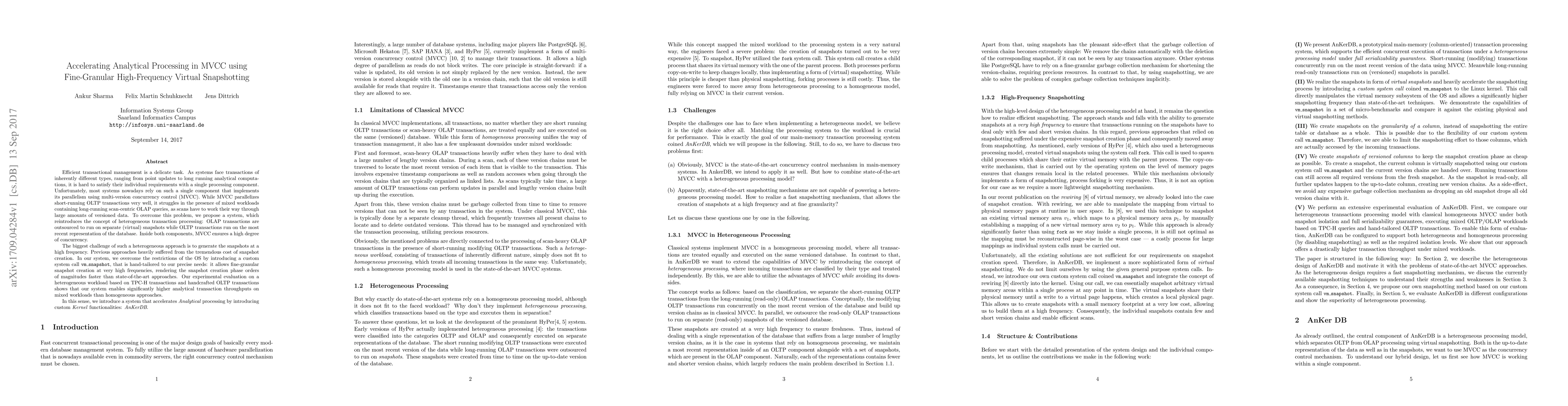 This paper proposes AnKerDB, a system that accelerates analytical processing in MVCC environments by using fine-granular high-frequency virtual snapshotting. It introduces a custom vm_snapshot system call to efficiently create frequent snapshots, enabling OLAP queries to run on separate snapshots while OLTP transactions operate on the most recent database state, thus significantly improving throughput for mixed workloads.