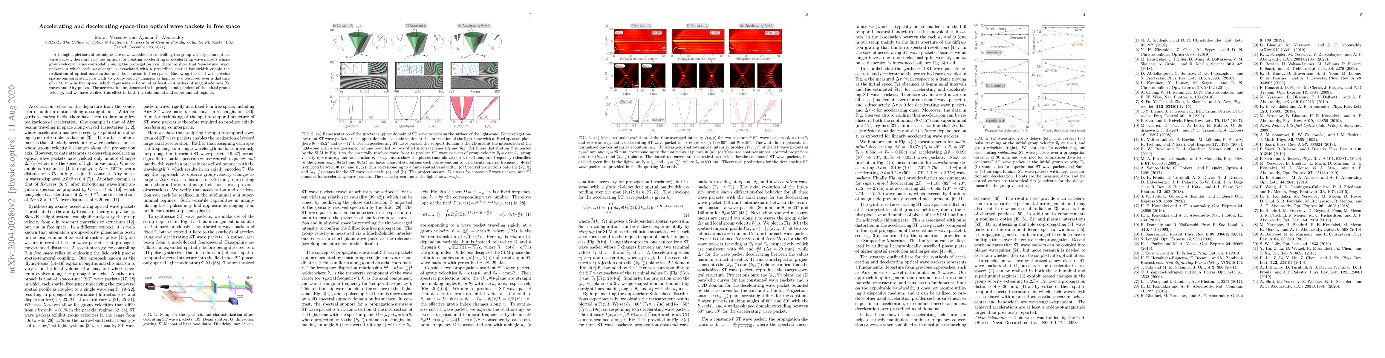 This research demonstrates the creation of "space-time" optical wave packets that enable controllable acceleration and deceleration of group velocity in free space, achieving velocity changes up to the speed of light over a short distance. The method involves associating each wavelength with a specific spatial bandwidth, achieving acceleration independent of initial velocity.