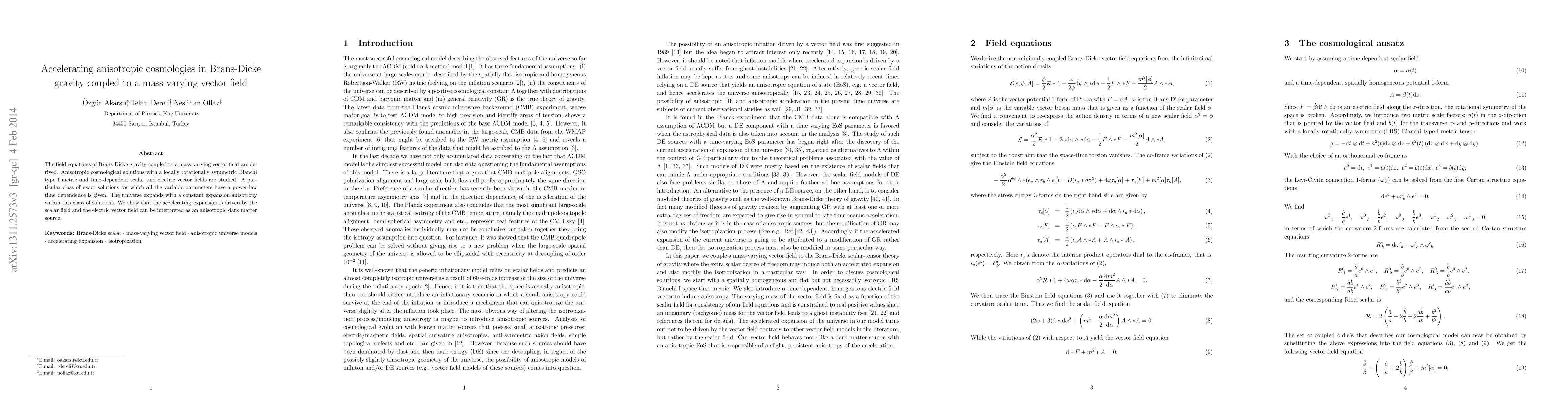 This paper derives the field equations for Brans-Dicke gravity coupled to a mass-varying vector field, and explores anisotropic cosmological solutions with a power-law time dependence. The accelerating expansion is driven by the scalar field, while the electric vector field acts as an anisotropic dark matter source.