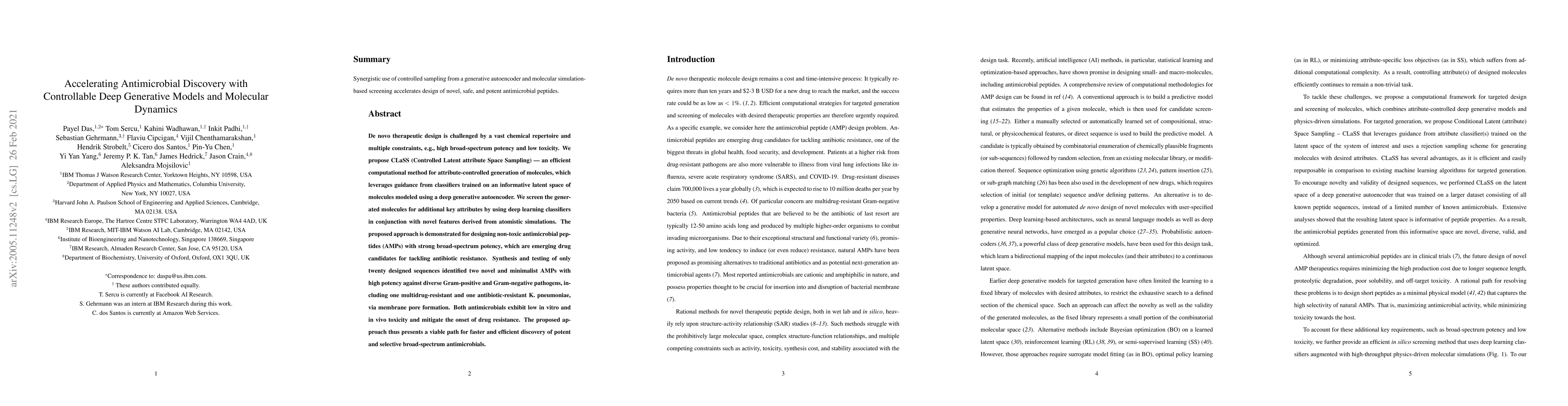 De novo therapeutic design is challenged by a vast chemical repertoire and multiple constraints, e.g., high broad-spectrum potency and low toxicity. We propose CLaSS (Controlled Latent attribute Space Sampling) - an efficient computational method for attribute-controlled generation of molecules, which leverages guidance from classifiers trained on an informative latent space of molecules modeled using a deep generative autoencoder. We screen the generated molecules for additional key attributes by using deep learning classifiers in conjunction with novel features derived from atomistic simulations. The proposed approach is demonstrated for designing non-toxic antimicrobial peptides (AMPs) with strong broad-spectrum potency, which are emerging drug candidates for tackling antibiotic resistance. Synthesis and testing of only twenty designed sequences identified two novel and minimalist AMPs with high potency against diverse Gram-positive and Gram-negative pathogens, including one multidrug-resistant and one antibiotic-resistant K. pneumoniae, via membrane pore formation. Both antimicrobials exhibit low in vitro and in vivo toxicity and mitigate the onset of drug resistance. The proposed approach thus presents a viable path for faster and efficient discovery of potent and selective broad-spectrum antimicrobials.