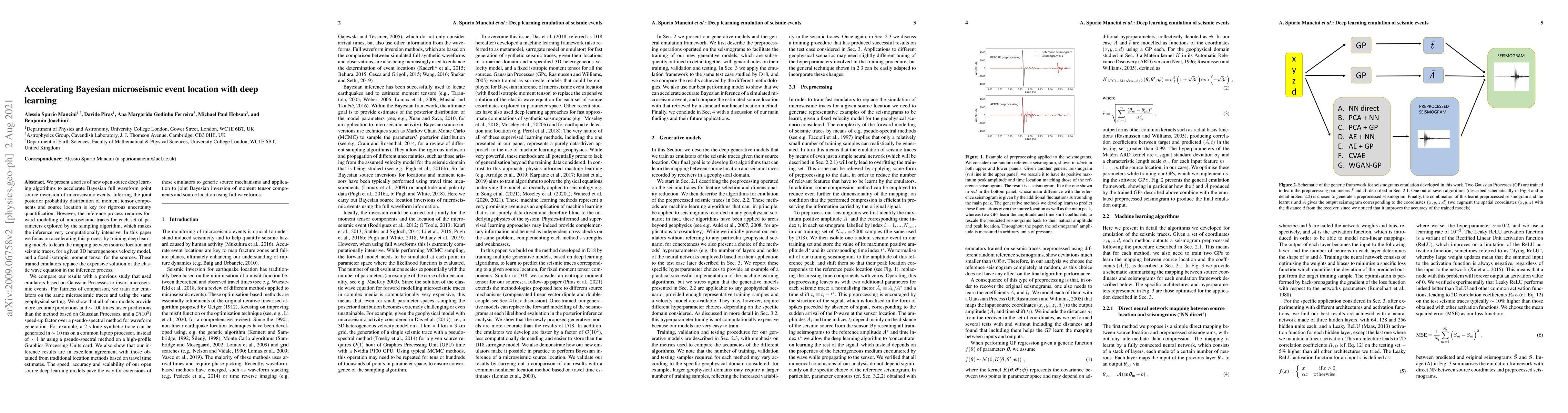 This paper introduces deep learning algorithms to significantly accelerate Bayesian microseismic event location by training models to map source locations to seismic traces, achieving $\sim 100$ times faster predictions than Gaussian Processes and a $\mathcal{O}(10^5)$ speed-up over pseudo-spectral methods, while maintaining high accuracy.