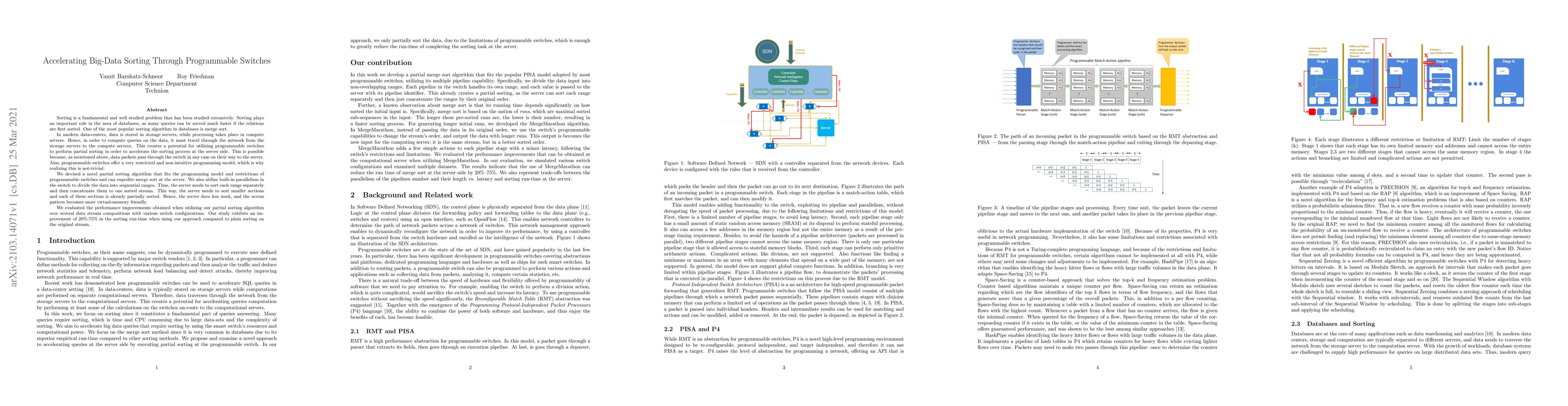 This paper proposes a novel partial sorting algorithm to leverage programmable switches in data centers for accelerating big-data sorting, particularly merge sort. The algorithm divides data into smaller, partially sorted ranges using switch parallelism, reducing server sorting workload and improving virtual-memory access patterns, resulting in a 20%-75% reduction in sorting runtime.