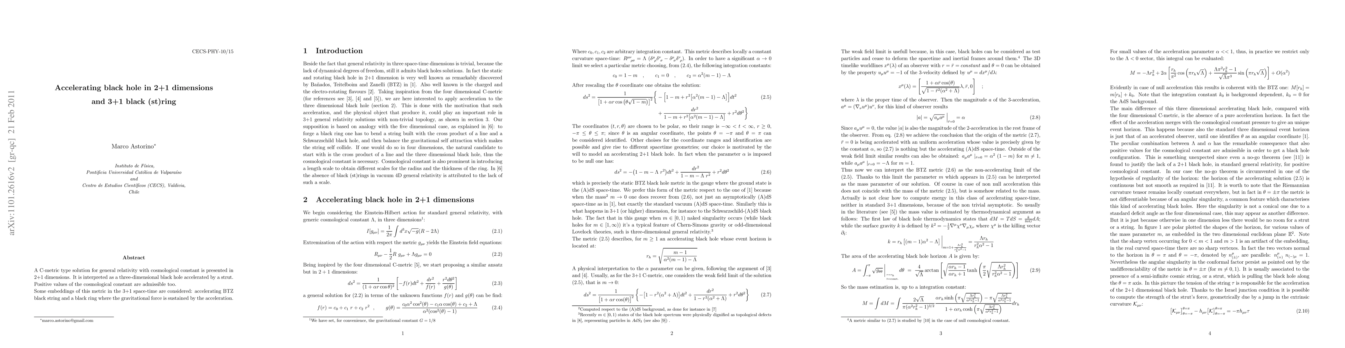 This paper presents a C-metric solution for 2+1 dimensional general relativity with a cosmological constant, interpreted as a three-dimensional black hole accelerated by a strut. It also explores embeddings in 3+1 dimensions, including an accelerating BTZ black string and a black ring.