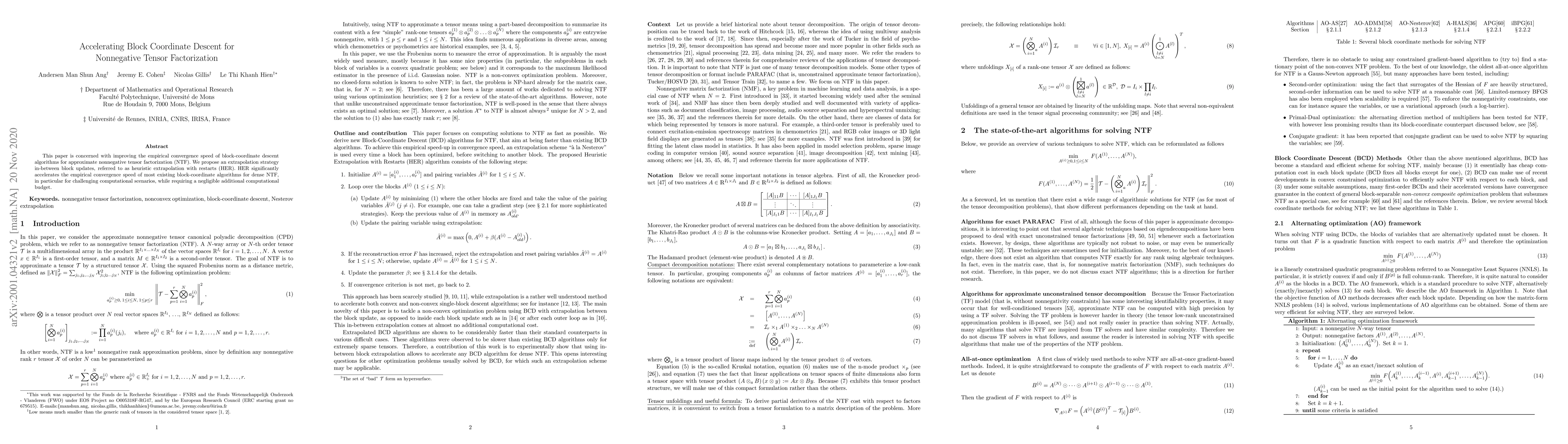 This paper introduces a heuristic extrapolation with restarts (HER) strategy to accelerate block-coordinate descent algorithms for nonnegative tensor factorization, significantly improving convergence speed with minimal extra computational cost.