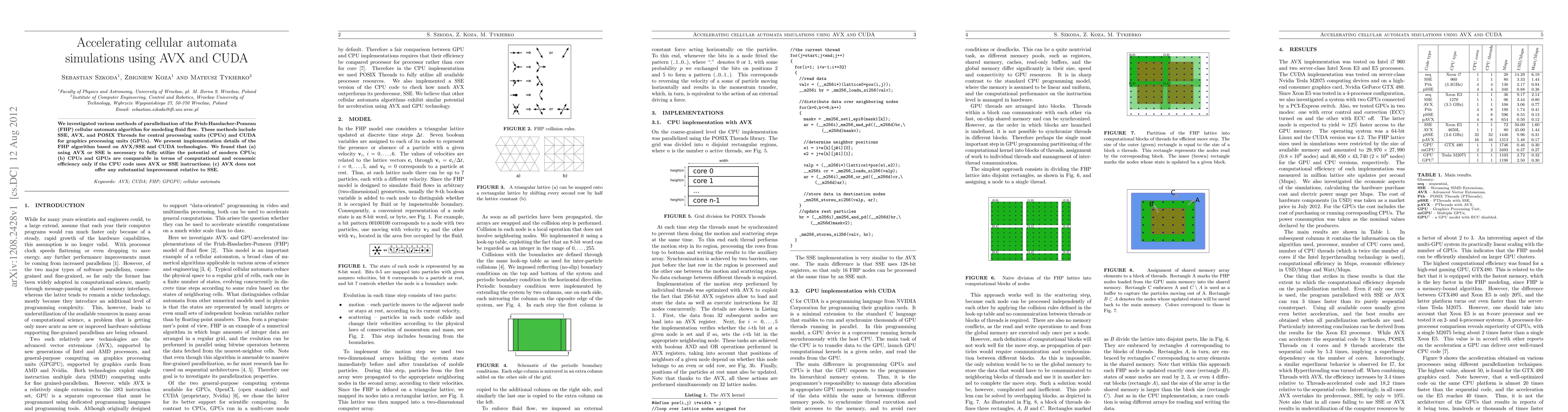 This research explores parallelization techniques for the FHP cellular automata algorithm, including SSE, AVX, and CUDA. It finds that AVX/SSE are essential for CPU optimization, while AVX offers no significant advantage over SSE, and CPUs and GPUs are comparable in efficiency when utilizing AVX/SSE.