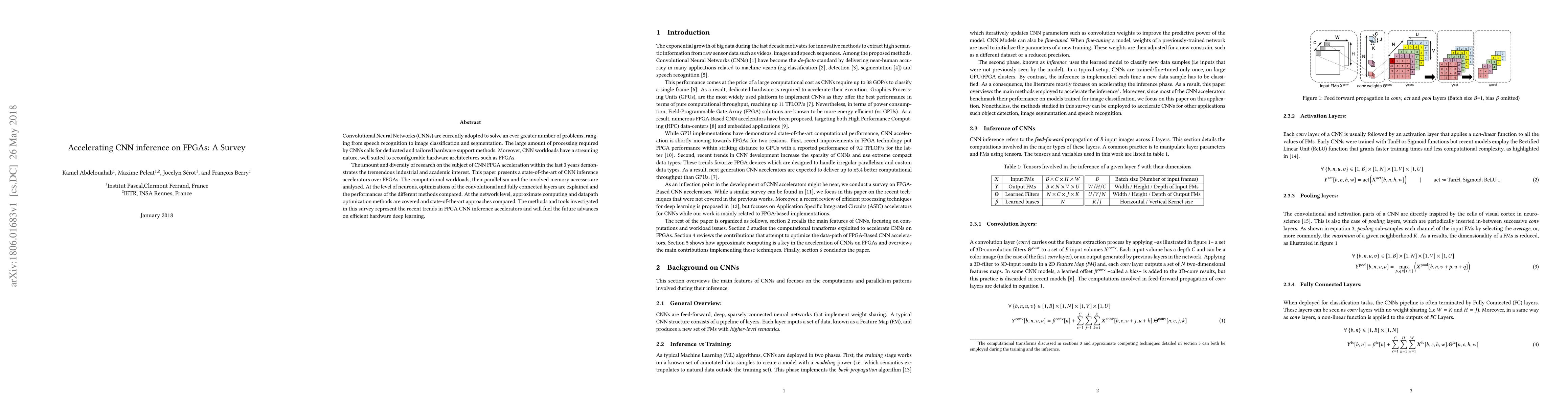 This paper surveys recent advancements in FPGA-based accelerators for CNN inference, analyzing computational workloads, parallelism, and memory accesses. It compares optimization techniques for convolutional and fully connected layers, and discusses state-of-the-art approaches for network-level approximate computing and datapath optimization.