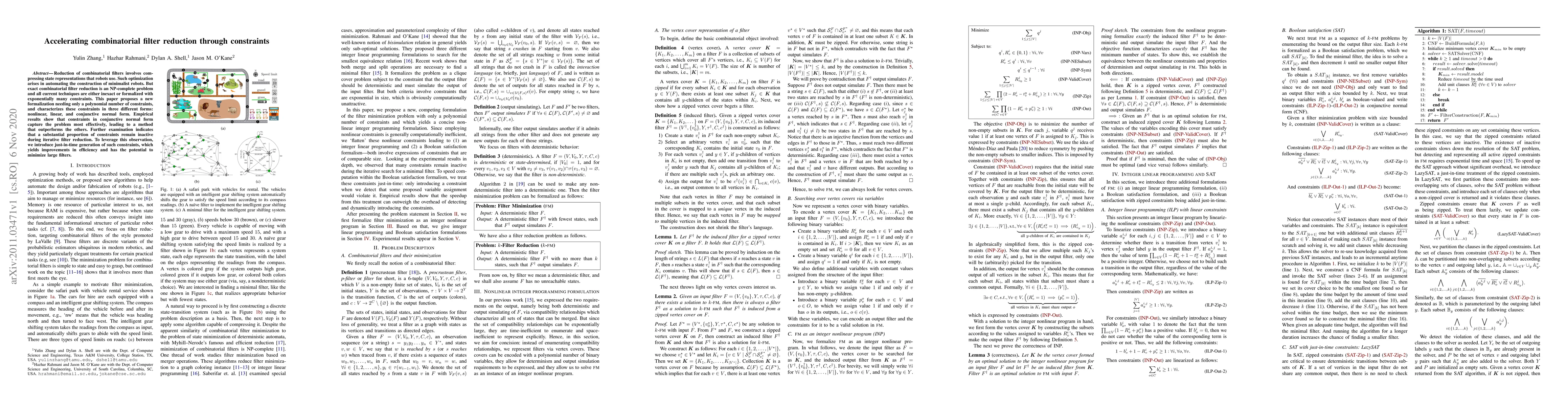 Reduction of combinatorial filters involves compressing state representations that robots use. Such optimization arises in automating the construction of minimalist robots. But exact combinatorial filter reduction is an NP-complete problem and all current techniques are either inexact or formalized with exponentially many constraints. This paper proposes a new formalization needing only a polynomial number of constraints, and characterizes these constraints in three different forms: nonlinear, linear, and conjunctive normal form. Empirical results show that constraints in conjunctive normal form capture the problem most effectively, leading to a method that outperforms the others. Further examination indicates that a substantial proportion of constraints remain inactive during iterative filter reduction. To leverage this observation, we introduce just-in-time generation of such constraints, which yields improvements in efficiency and has the potential to minimize large filters.