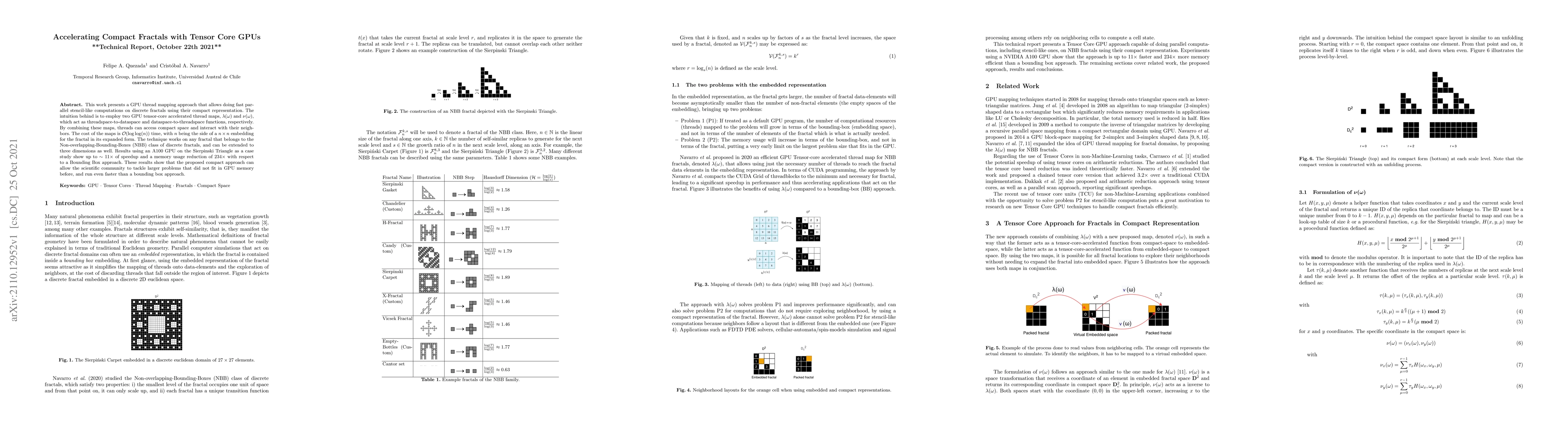 This work presents a GPU thread mapping approach that allows doing fast parallel stencil-like computations on discrete fractals using their compact representation. The intuition behind is to employ two GPU tensor-core accelerated thread maps, $\lambda(\omega)$ and $\nu(\omega)$, which act as threadspace-to-dataspace and dataspace-to-threadspace functions, respectively. By combining these maps, threads can access compact space and interact with their neighbors. The cost of the maps is $\mathcal{O}(\log \log(n))$ time, with $n$ being the side of a $n \times n$ embedding for the fractal in its expanded form. The technique works on any fractal that belongs to the Non-overlapping-Bounding-Boxes (NBB) class of discrete fractals, and can be extended to three dimensions as well. Results using an A100 GPU on the Sierpinski Triangle as a case study show up to $\sim11\times$ of speedup and a memory usage reduction of $234\times$ with respect to a Bounding Box approach. These results show that the proposed compact approach can allow the scientific community to tackle larger problems that did not fit in GPU memory before, and run even faster than a bounding box approach.
