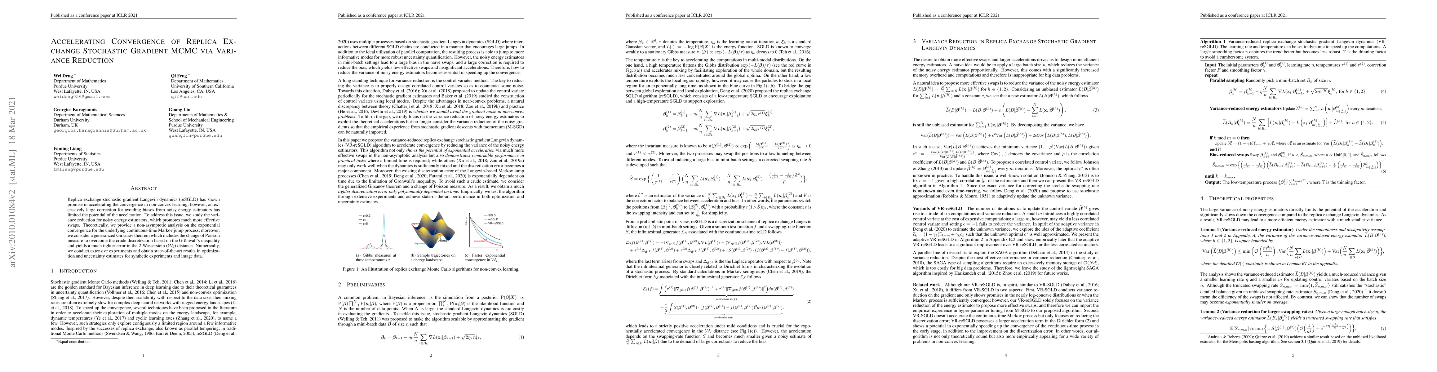 Replica exchange stochastic gradient Langevin dynamics (reSGLD) has shown promise in accelerating the convergence in non-convex learning; however, an excessively large correction for avoiding biases from noisy energy estimators has limited the potential of the acceleration. To address this issue, we study the variance reduction for noisy energy estimators, which promotes much more effective swaps. Theoretically, we provide a non-asymptotic analysis on the exponential acceleration for the underlying continuous-time Markov jump process; moreover, we consider a generalized Girsanov theorem which includes the change of Poisson measure to overcome the crude discretization based on the Gr\"{o}wall's inequality and yields a much tighter error in the 2-Wasserstein ($\mathcal{W}_2$) distance. Numerically, we conduct extensive experiments and obtain the state-of-the-art results in optimization and uncertainty estimates for synthetic experiments and image data.